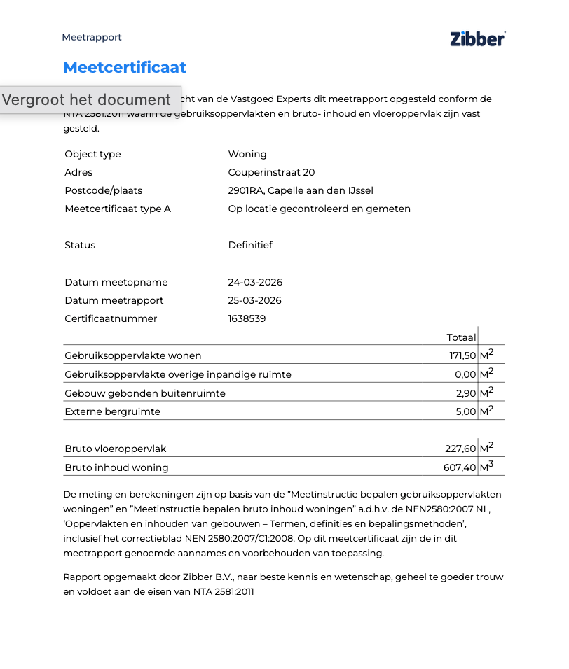 Koper kan geen rechten ontlenen aan de opgegeven maatvoering/meetrapport. Koper wordt voor het tot stand komen van een overeenkomst in de gelegenheid gesteld de woning op te (laten) meten.