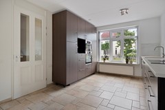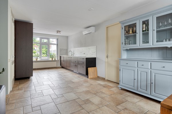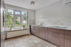 De recent vervangen inbouwkeuken is aan de straatzijde geplaatst aan beide zijden. Dit zorgt voor licht een veel werkplek. Aan een zijde is een handige koffiecorner gemaakt.