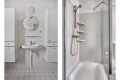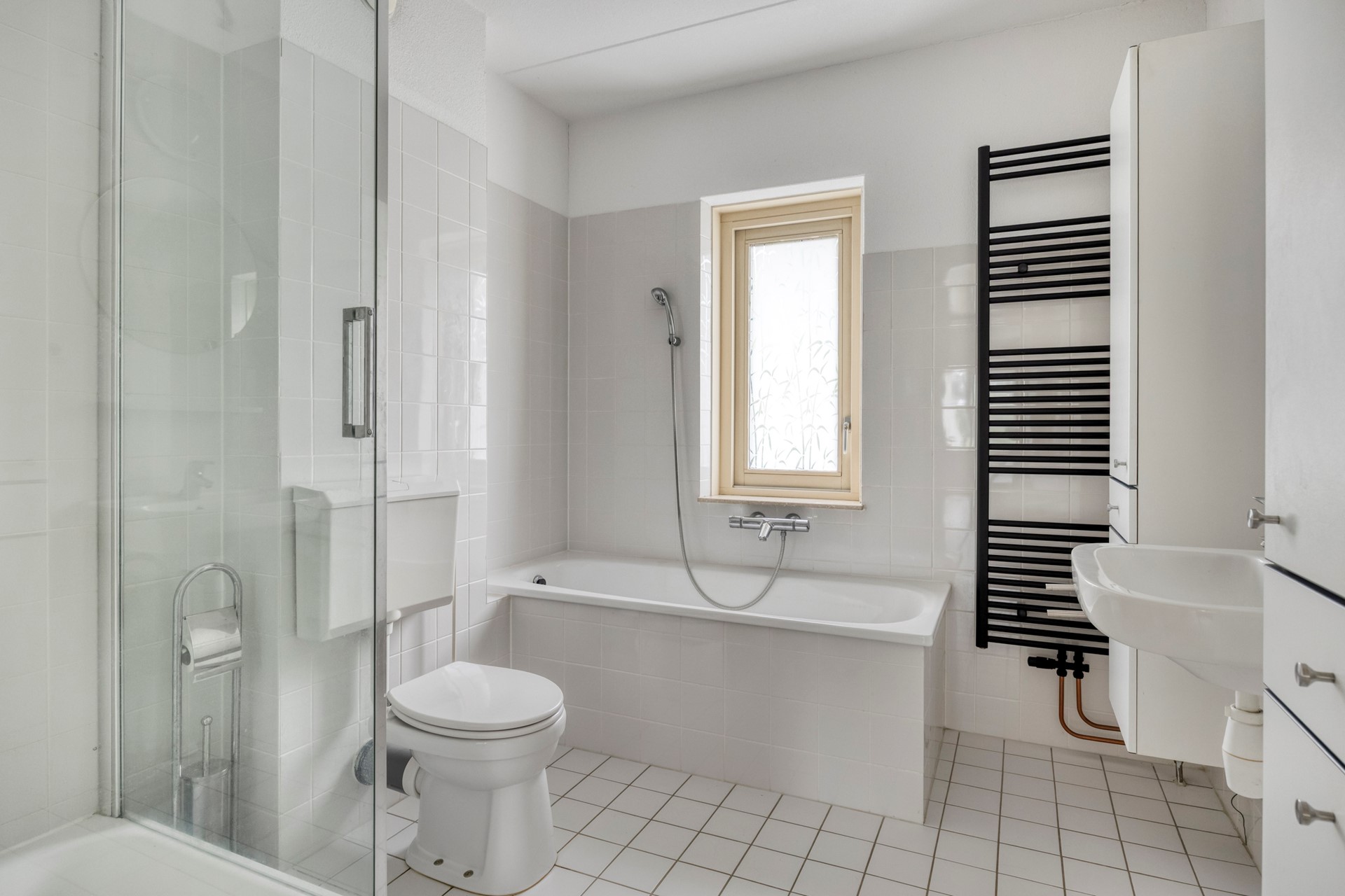 Vanuit de overloop bereik je de drie slaapkamers. De badkamer is volledig betegeld in een lichte kleurstelling en praktisch ingericht met een nieuwe glazen douchecabine en designradiator, een wastafel, een tweede toilet, een ligbad en een raampartij.