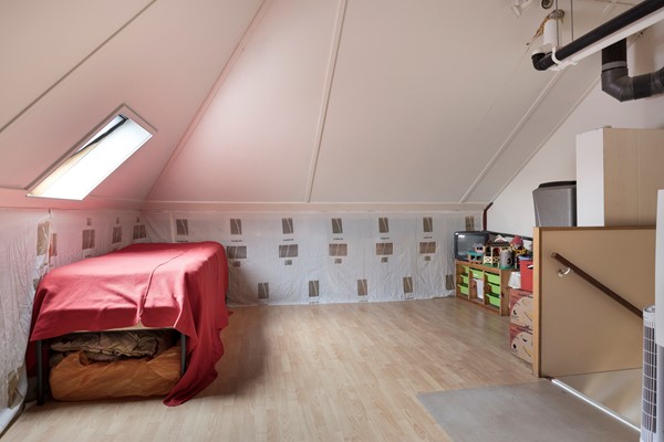 Met vaste trap bereik je de tweede verdieping met hoge nok. In deze ruimte vind je ook de opstelling van de HR-combiketel met WTW en zonneboiler en de aansluitingen voor een wasmachine en/of droger. Door het dakraam en de hoge nok kun je hier prima een vierde slaapkamer maken, maar als zolder voor opslag of als sportkamer voldoet deze ruimte ook goed.