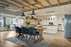 De royale leefkeuken, een lichte open ruimte met balken in het zicht nodigen uit om te koken, te leven en te genieten. De landelijke inbouwkeuken is voorzien van veel werkruimte en een werkeiland met een spoelbak, een 6-pits gasstel, een oven en een Amerikaanse koelkast.