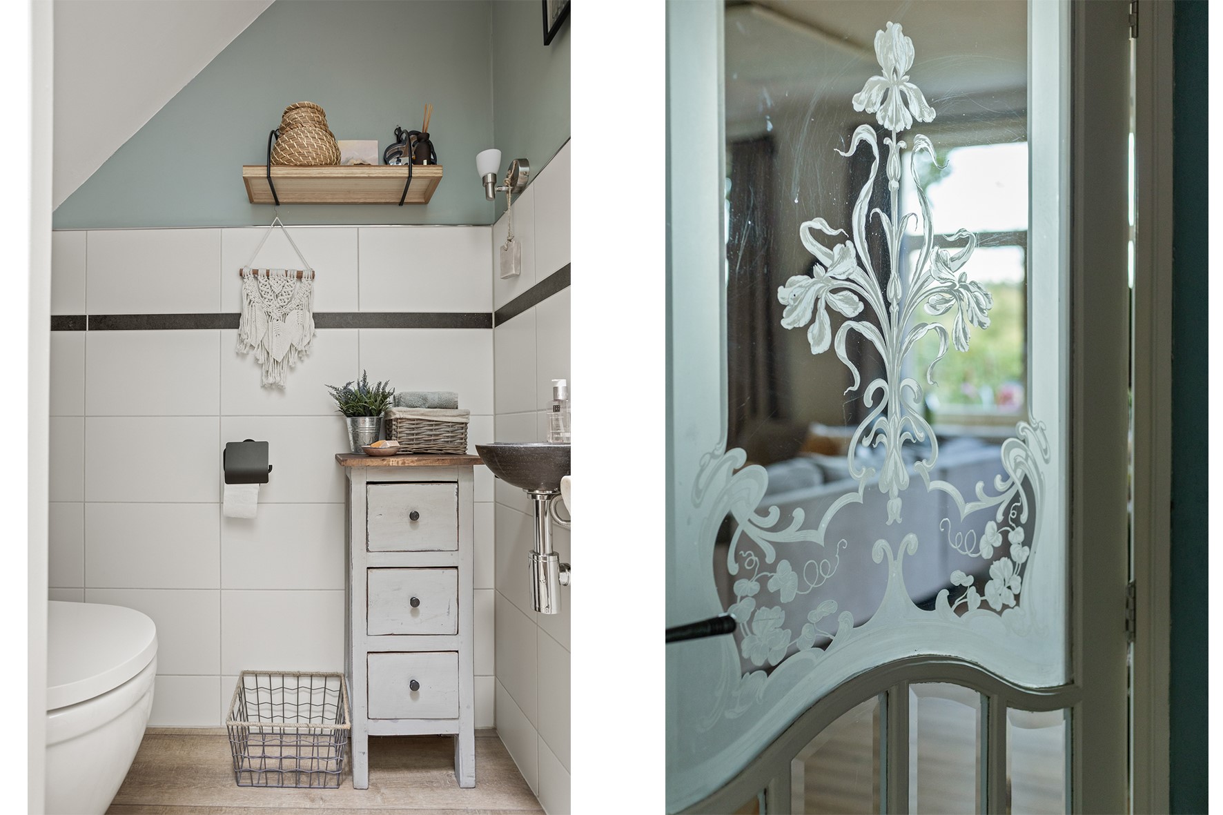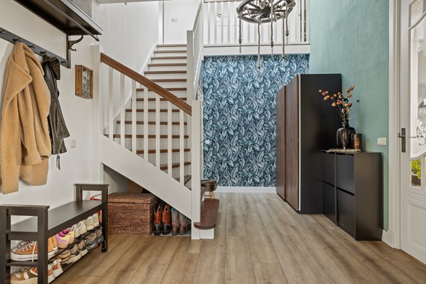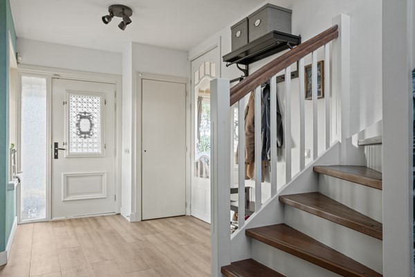 Je bereikt de overdekte voordeur via de zijgevel van de woning en stapt een royale hal binnen met de fraaie trapopgang van de eerste verdieping. Hier bevindt zich ook een (gasten)toilet.
