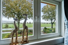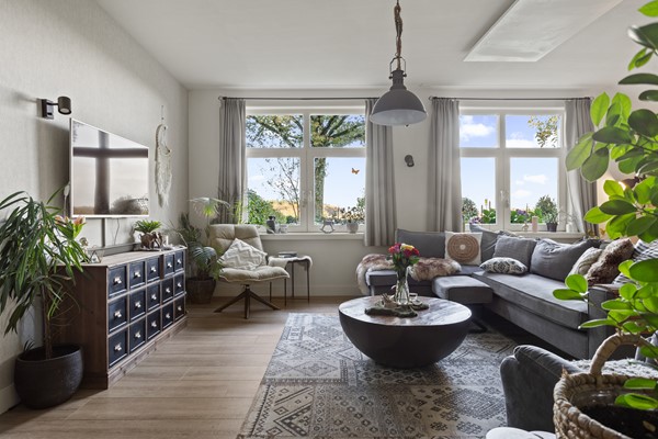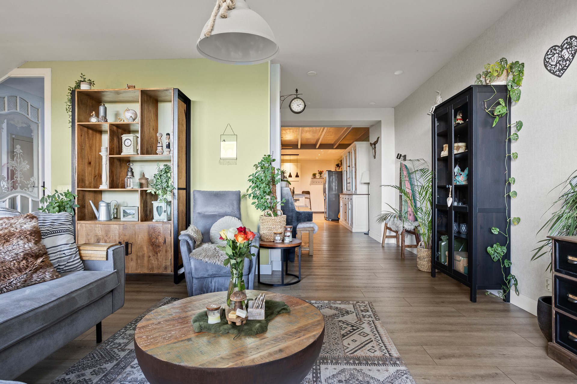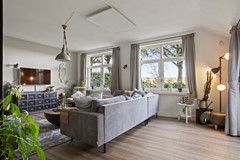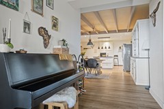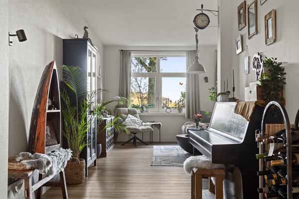 In de doorloop van de keuken naar de woonkamer is ruimte volop voor een buffetkast of piano. De woonkamer aan de voorzijde is over de breedte van de woning gesitueerd en biedt ruimte voor een grote hoekbank.