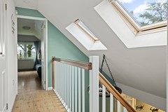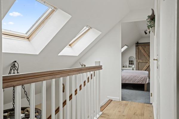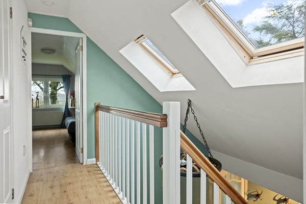 We zijn weer rond en staan weer in de hal. Met de trap bereik je de eerste verdieping met vide. Vanuit de open trap heb je contact met beneden. De twee dakramen zorgen voor extra lichtinval.