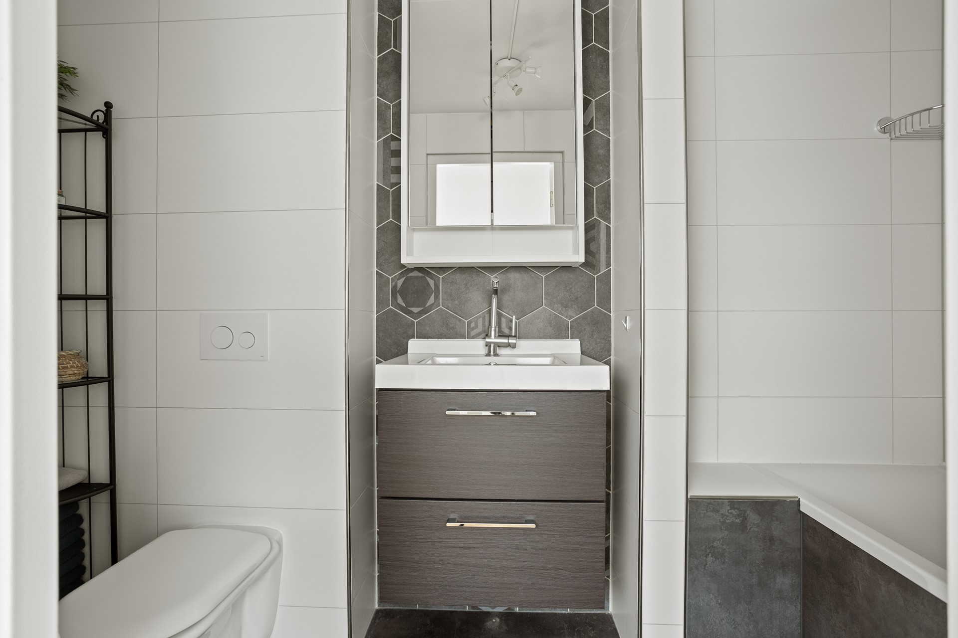 De tussengelegen badkamer in moderne kleurstelling is voorzien van een douchebad, een zwevend toilet, een wastafelmeubel en een designradiator.