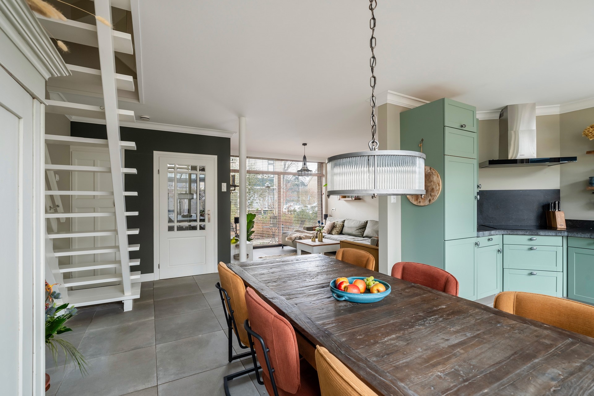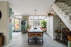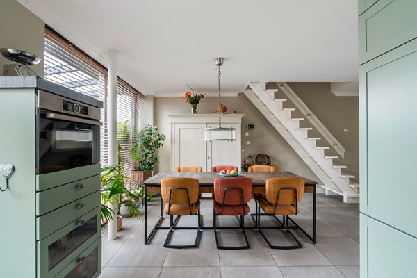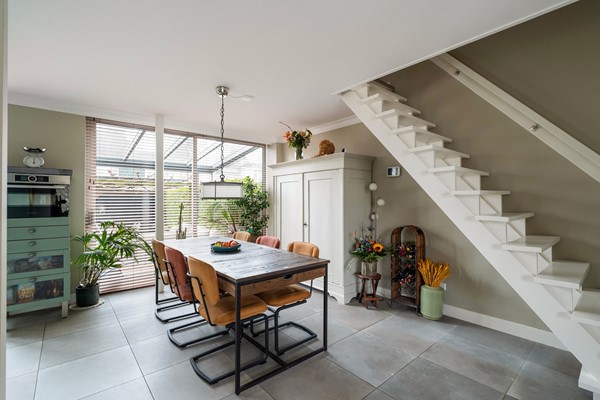 Aan de achterzijde van de woning bevindt zich de royale eethoek, die met recht de 'stamtafel' van het huis genoemd mag worden. Dit is dé plek waar het gezinsleven samenkomt. Of het nu gaat om een uitgebreid diner, het doornemen van de dag met een goede kop koffie, of een fanatieke spelletjesavond met vrienden; de ruimte leent zich hier perfect voor.