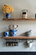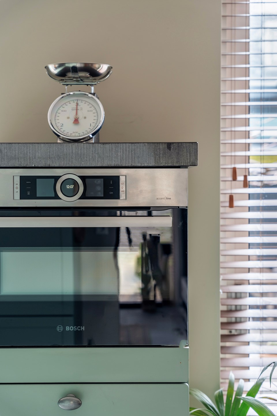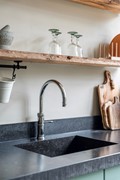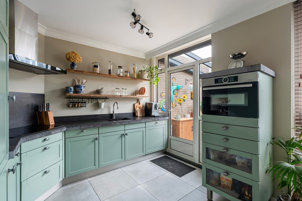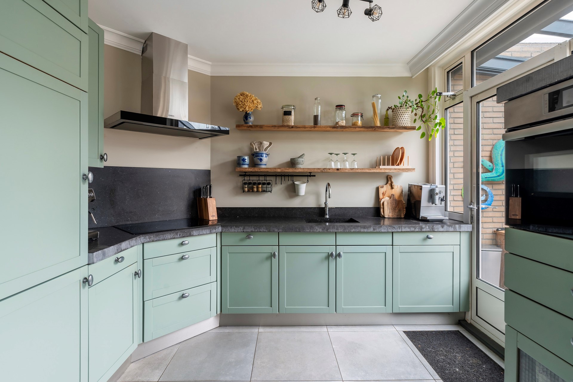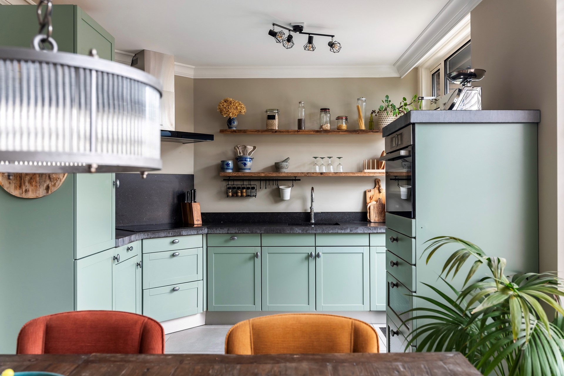 De eethoek staat in open verbinding met de hoekkeuken, die onlangs is gerenoveerd in een eigentijdse groene tint met een chique zwart composiet blad. Terwijl de kok aan de slag gaat met de luxe apparatuur — zoals de zone-inductiekookplaat en de Quooker — blijven de gasten aan tafel gezellig betrokken bij het koken.