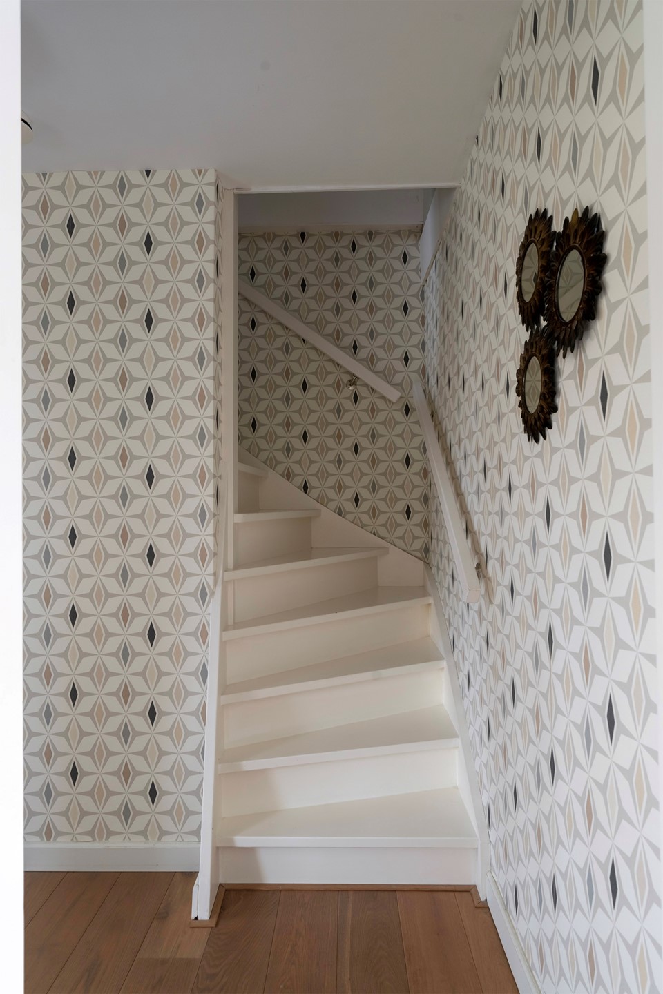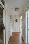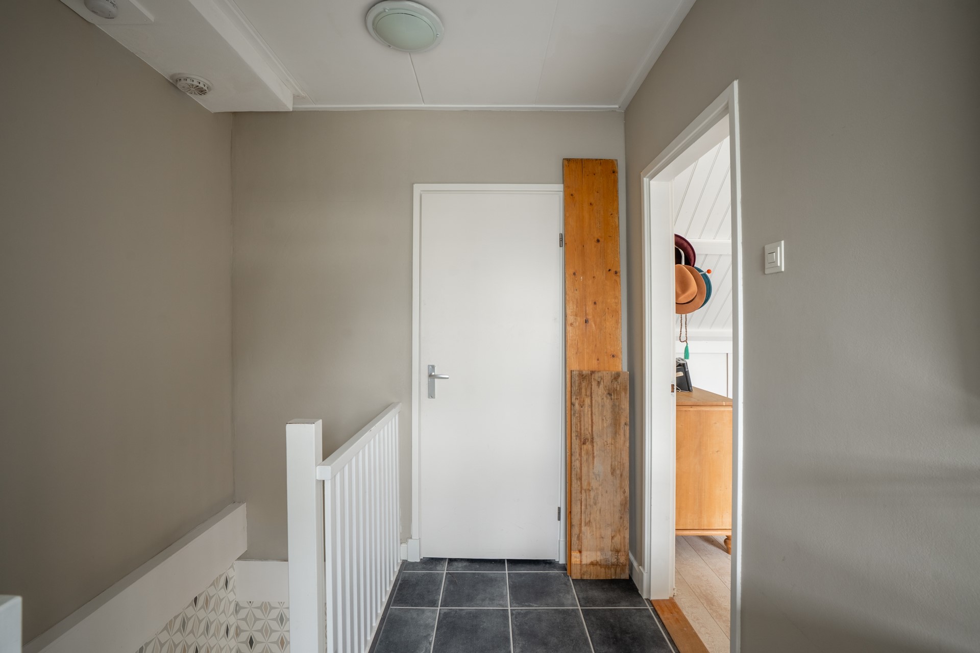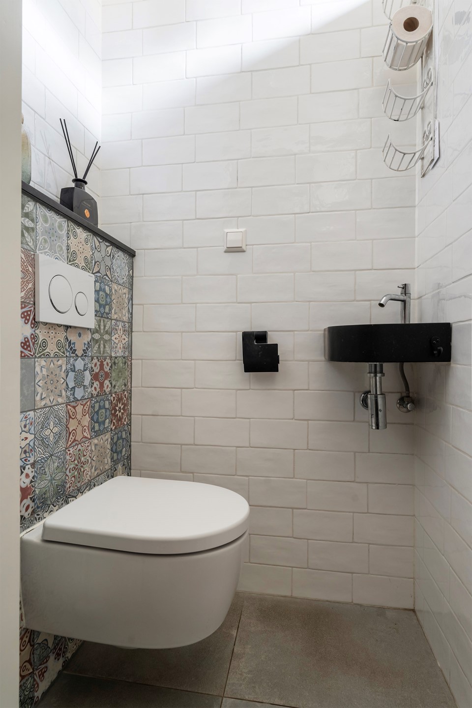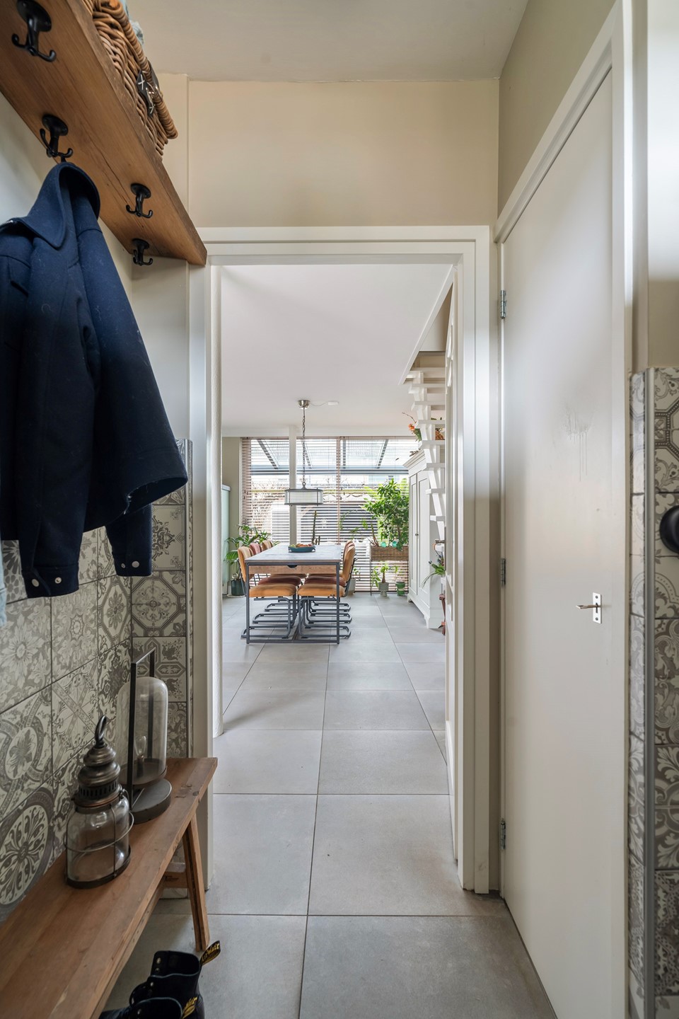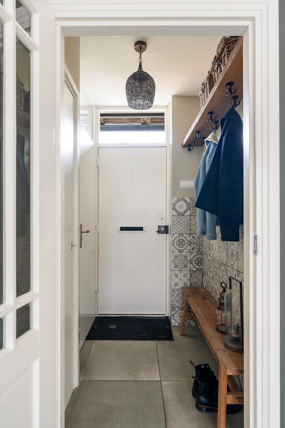 Via de verzorgde voortuin bereik je de entree. In de hal vind je de garderobe, meterkast en een modern toilet. Deze is stijlvol afgewerkt met witte wandtegels, een vrolijke gekleurde tegel achter het zwevende toilet en een praktisch fonteintje.