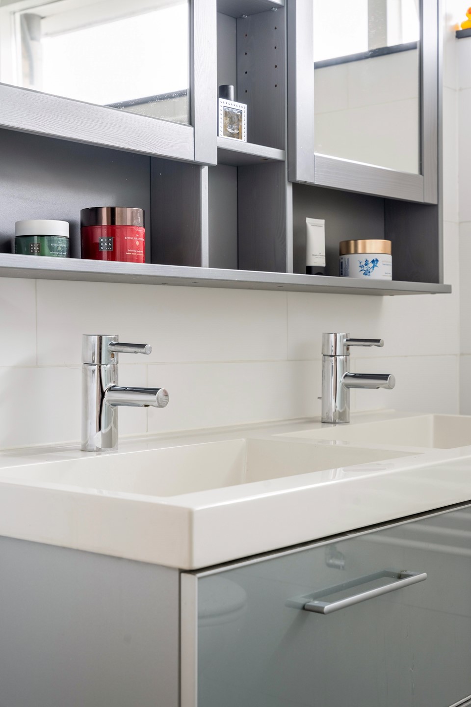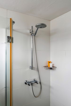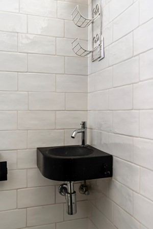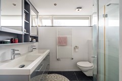 De moderne badkamer is strak afgewerkt met witte wandtegels, een zwarte vloertegel en een gestuukt plafond met inbouwspots. Je vindt hier een douchecabine, een dubbel wastafelmeubel, een tweede zwevend toilet en prettig invallend daglicht.