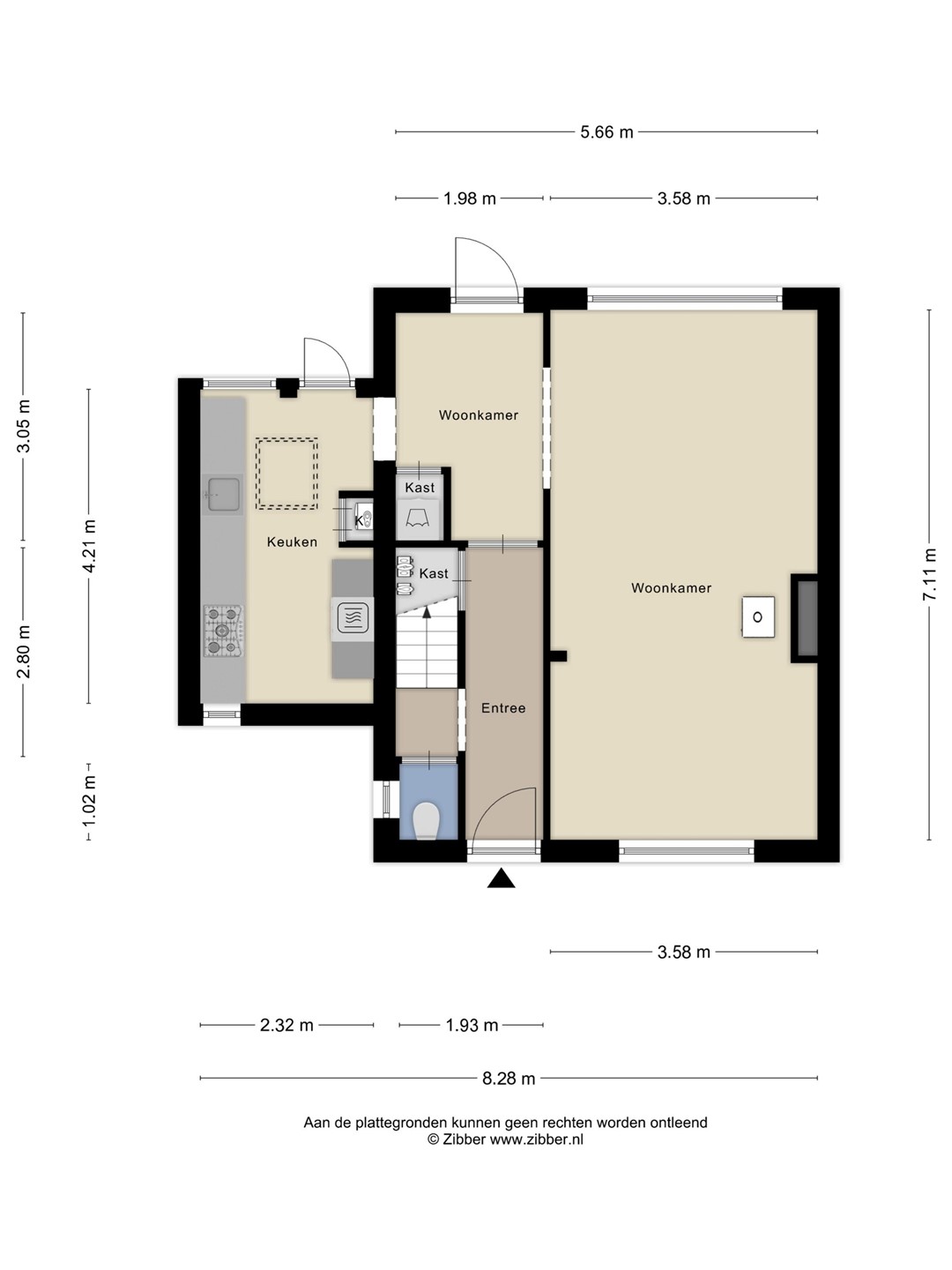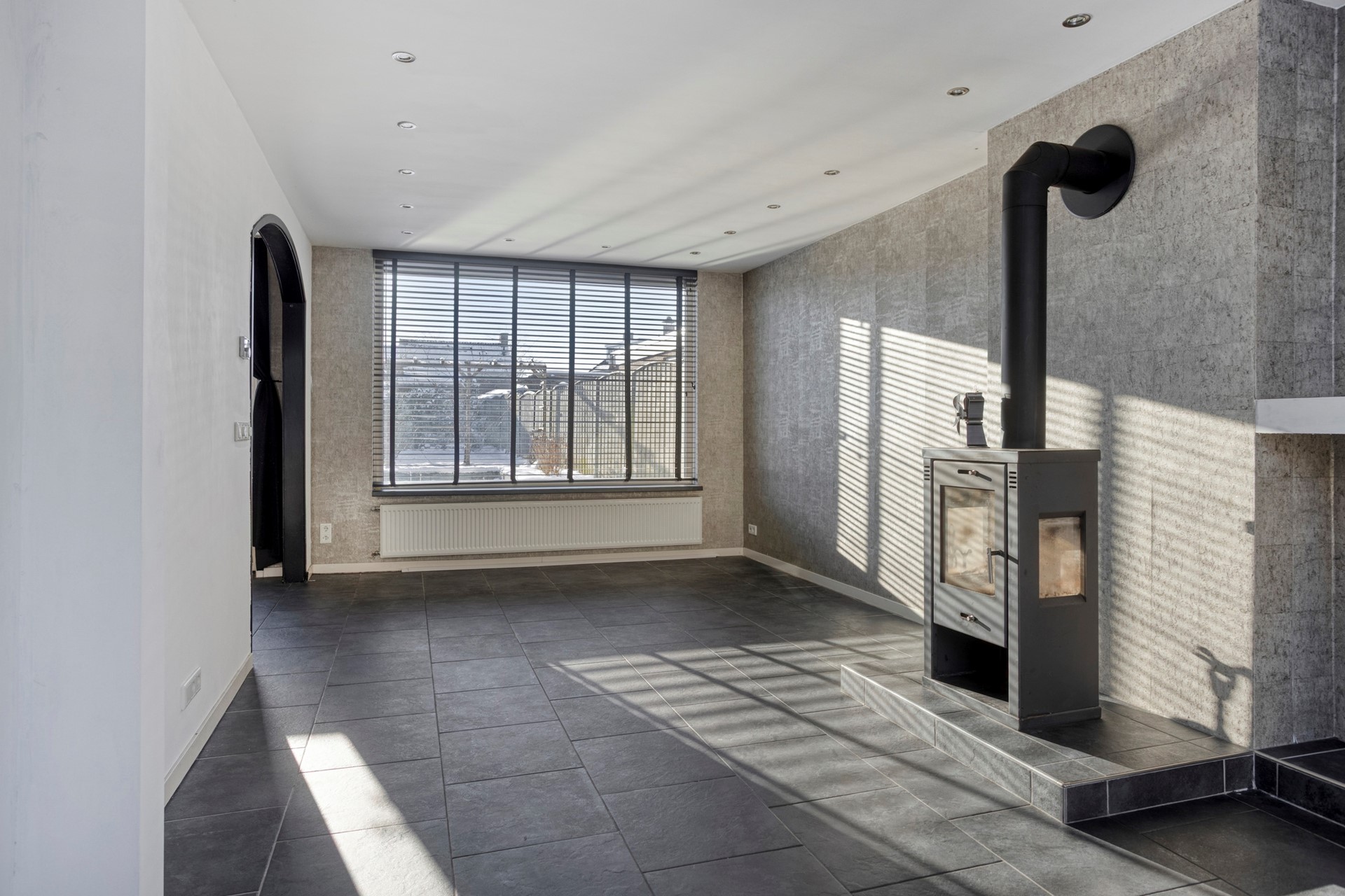 Entree in hal met trapkast waar ook de meterkast zich bevindt (12 groepen, 3 aardlekschakelaars). Het toilet bevindt zich een treetje hoger dan de hal en heeft een wandcloset. Via een mooie deur kom je in de woonkamer. Het eerste deel heeft een waskast met de aansluitingen voor de wasmachine en droger: handig als je je was buiten wil drogen. Via een boog kom je in de het tweede deel dat door de grote ramen heerlijk licht is. Een houtkachel zorgt voor extra sfeer en warmte.