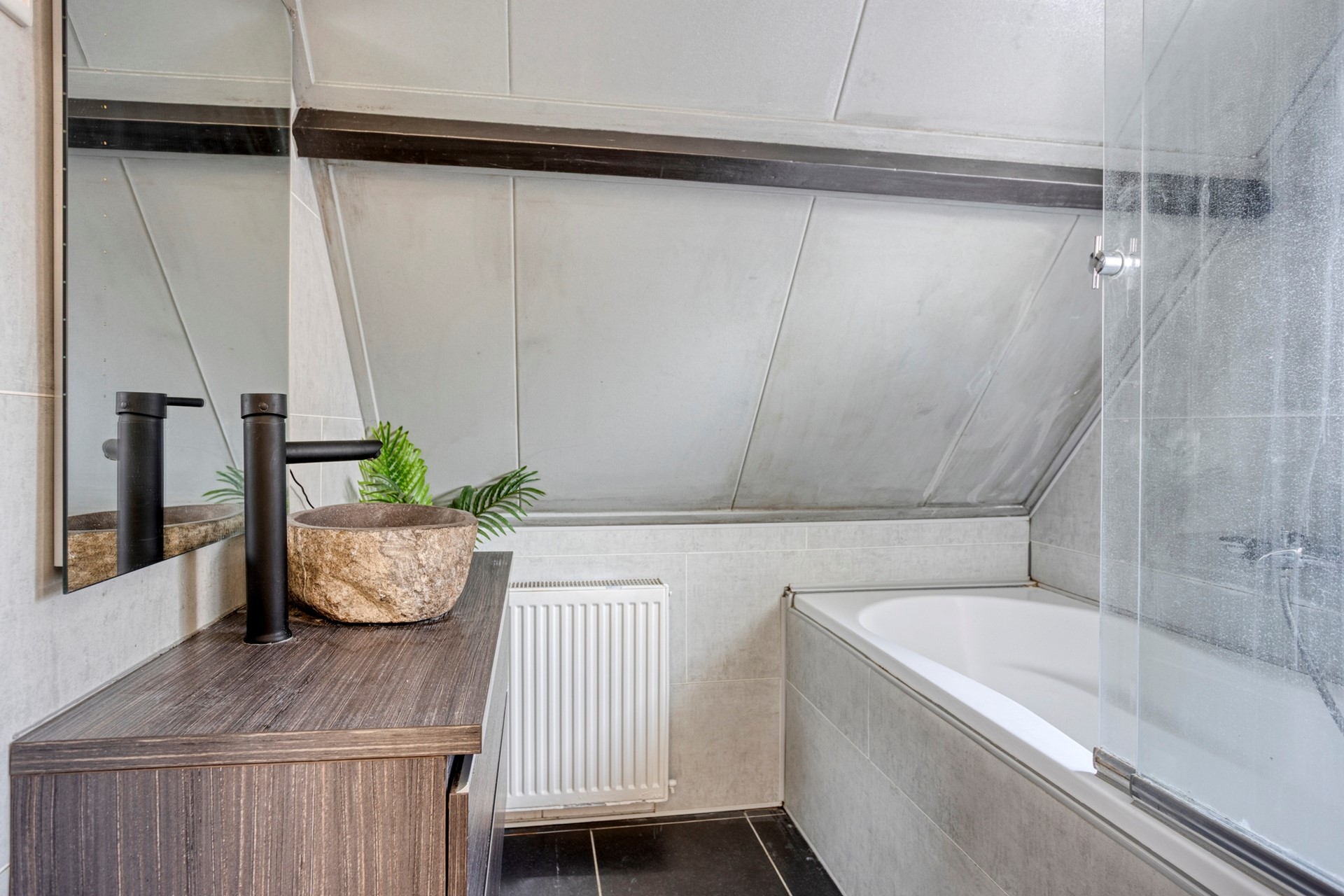 De badkamer is klein maar fijn, zeker voor de bad liefhebbers. Hij is namelijk efficiënt ingericht met een ligbad met een douche erin en een wastafel meubel.