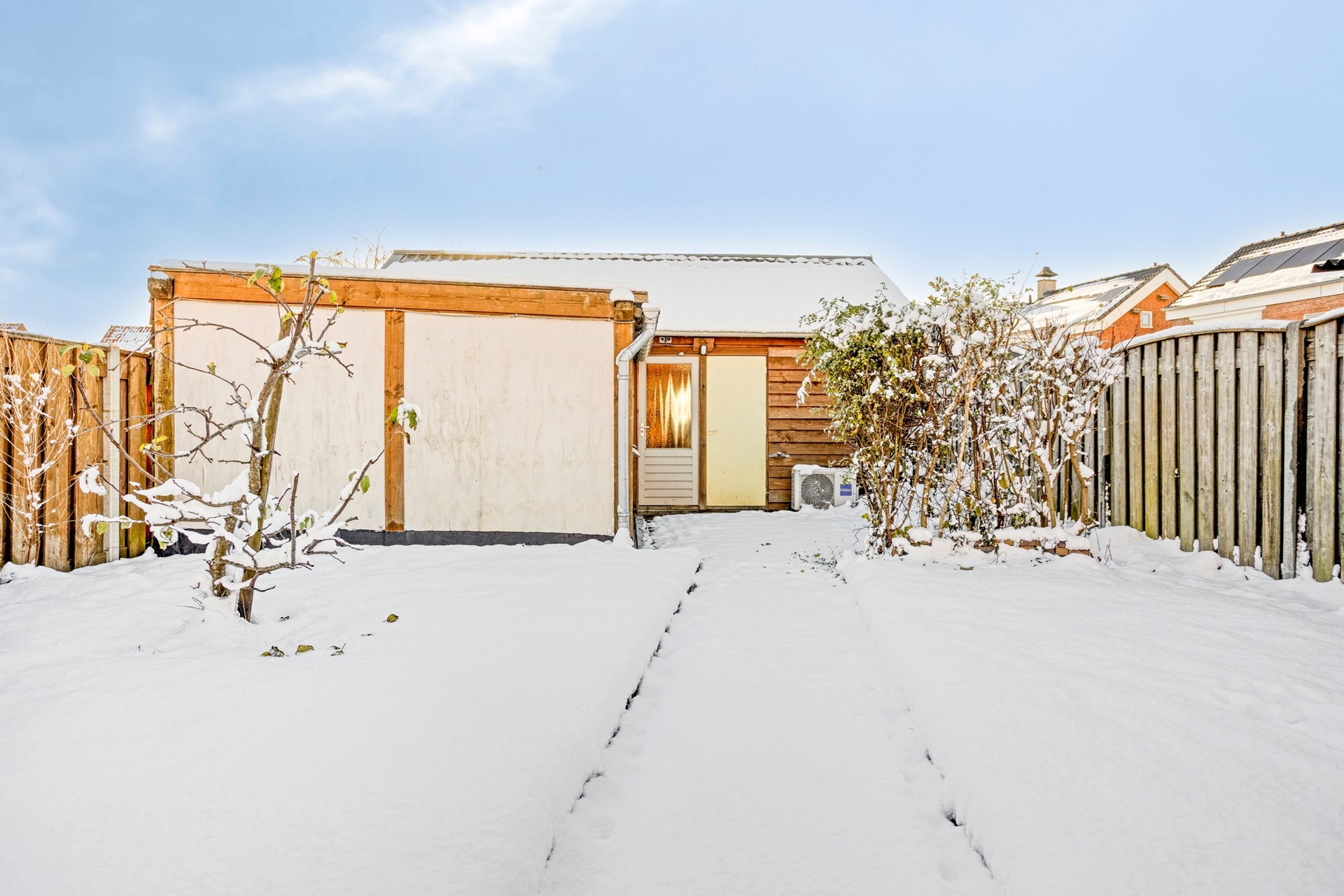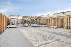 Last but not least komen we in de tuin. Op de foto zie je deze bedekt onder een dikke laag sneeuw, maar natuurlijk ben je ook benieuwd wat eronder ligt. De tuin is leuk aangelegd met sierbestrating, plantenbakken en een pergola. De tuin is maar liefst 290 m² en ligt op het Zuidwesten. Daarmee is hij heerlijk zonnig.