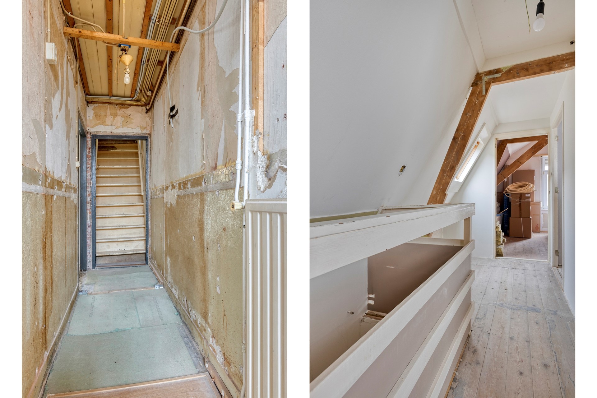 Hier is de originele houten vloer zichtbaar en ook de nokbalken zijn zichtbaar op zowel de overloop als de grote slaapkamer. Dit geeft een leuk nostalgisch effect. Wat ga jij hiermee doen? Blijven ze in het zicht en verf je ze in je eigen favoriete kleur? We zijn benieuwd!