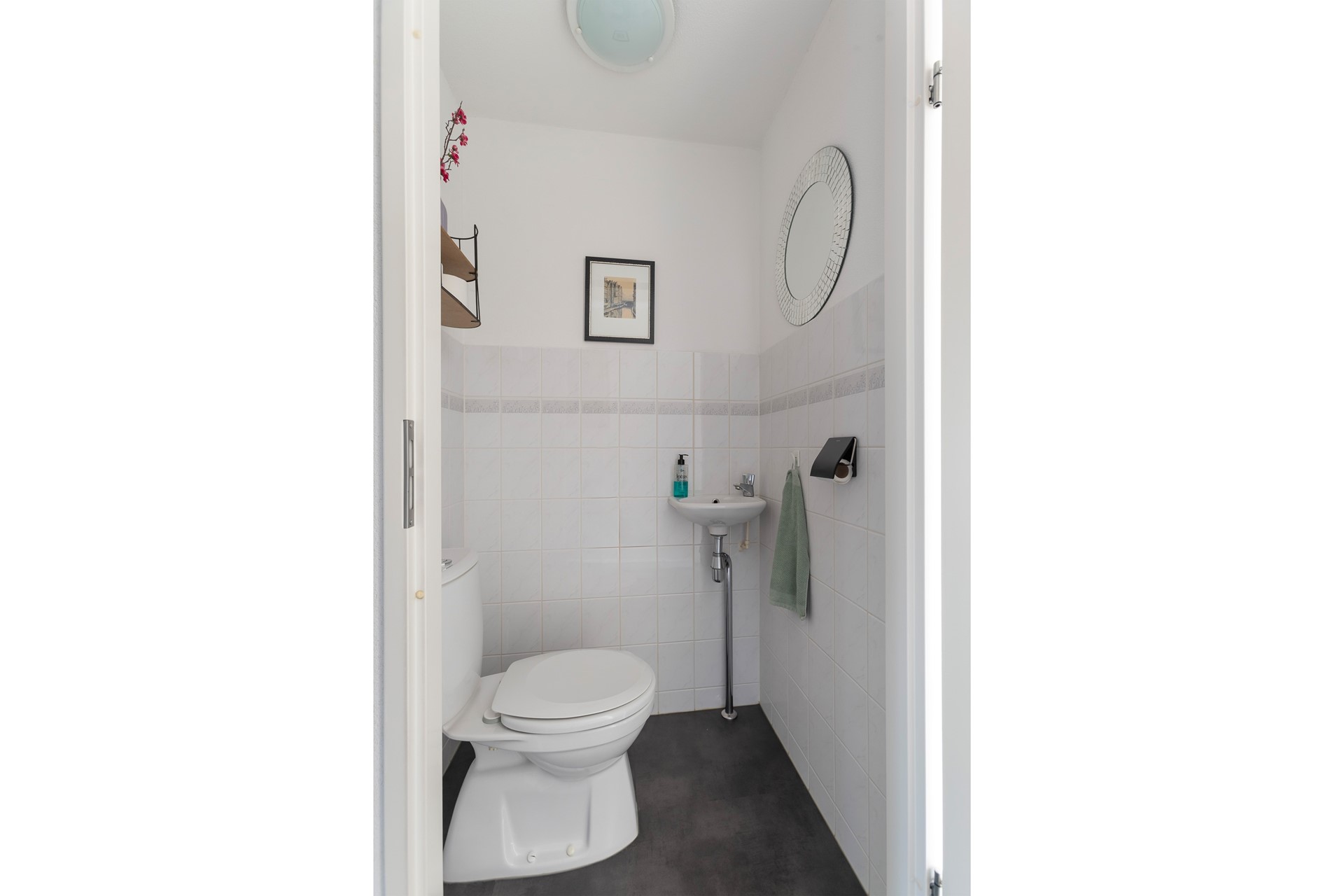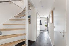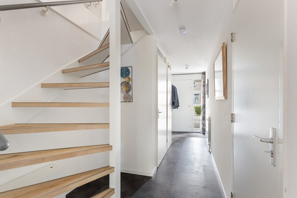 Ruime hal met meterkast (5 groepen en glasvezel), toiletruimte met fontein en mechanische ventilatie. Vanuit de hal bereik je de garage, de trap naar de eerste verdieping en de woonkamer.