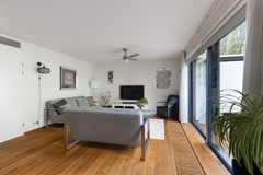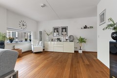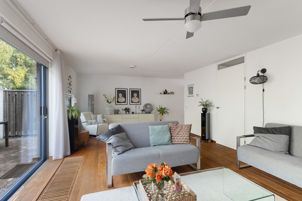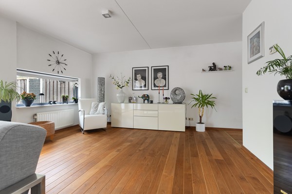 Lichte, tuingerichte woonkamer met een royale aluminium schuifpui die zorgt voor veel natuurlijk licht. De vloer is voorzien van een eikenhouten vloer. De woonkamer is voorzien van een convector put, waarbij tocht in de winter verleden tijd is.