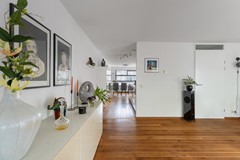 Binnen valt direct het gevoel van ruimte en licht op. De grote raampartijen en schuifpui zorgen voor een zonnige woonkamer, terwijl het eiken parketvloer meteen een warme, huiselijke sfeer geeft.