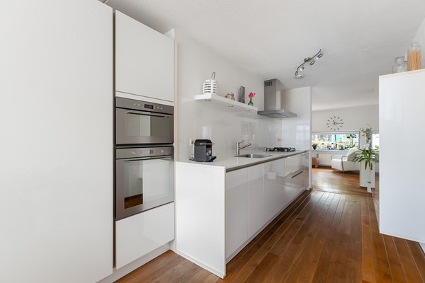 Aan de zijkant van de woning bevindt zich een nette hoogglans keuken, uitgerust met diverse inbouwapparatuur: nieuw geplaatste vaatwasser (siemens), oven, combimagnetron en een 5-pits gasfornuis met afzuiging.