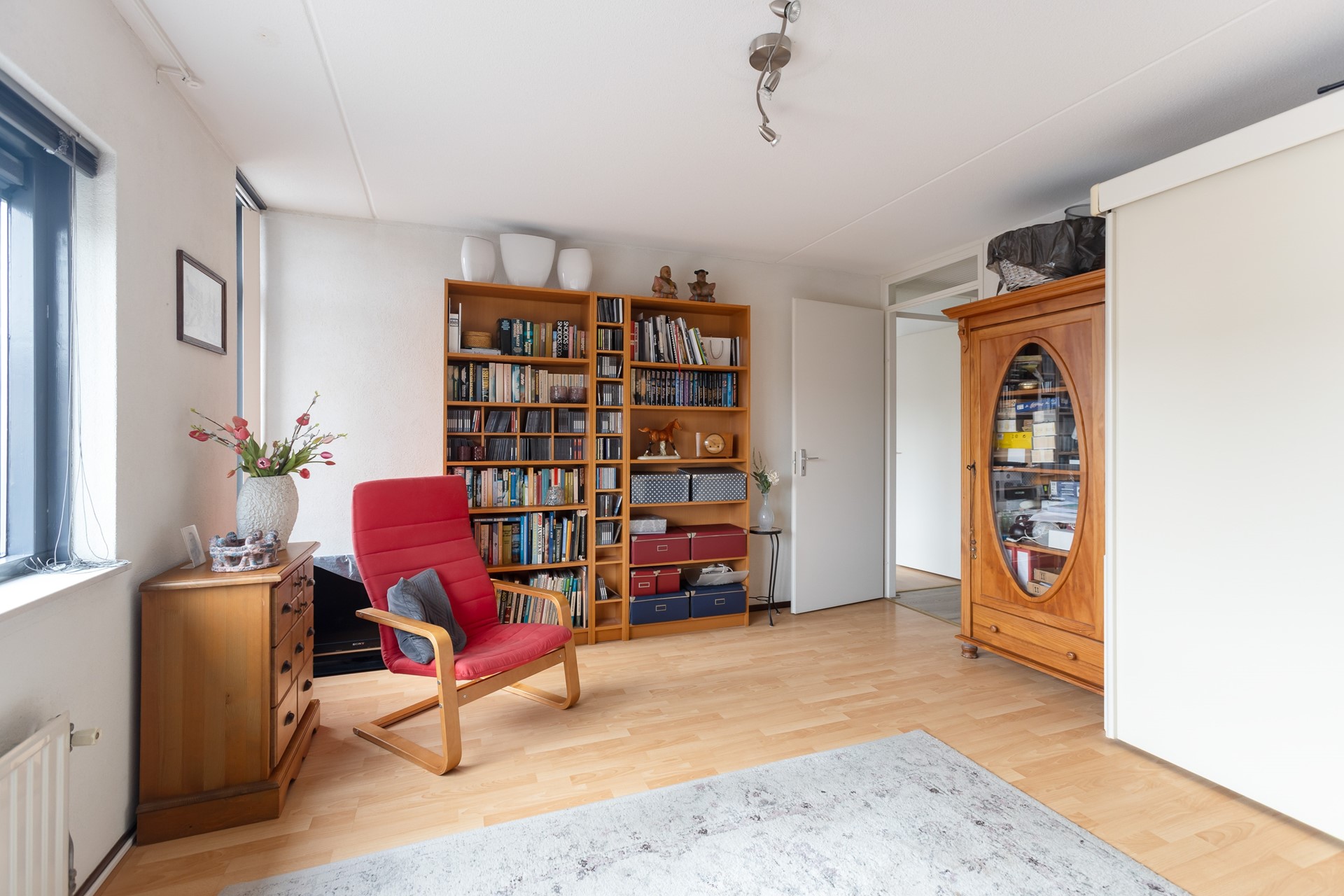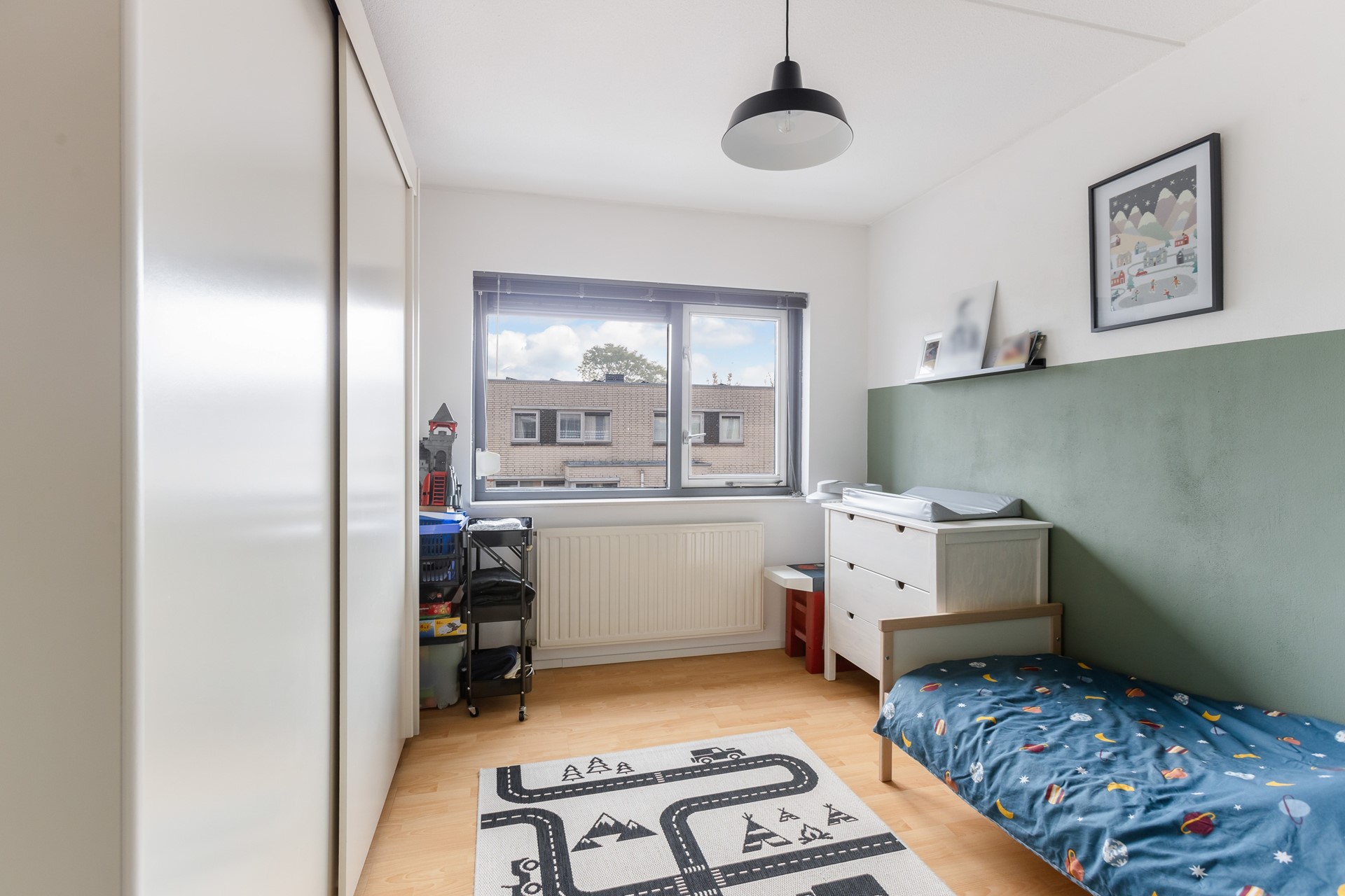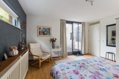 Ruime slaapkamer met extra lichtinval door het zijraam en een kozijn met deur naar het dakterras. Vanaf het terras heb je zicht op de achtertuin.
