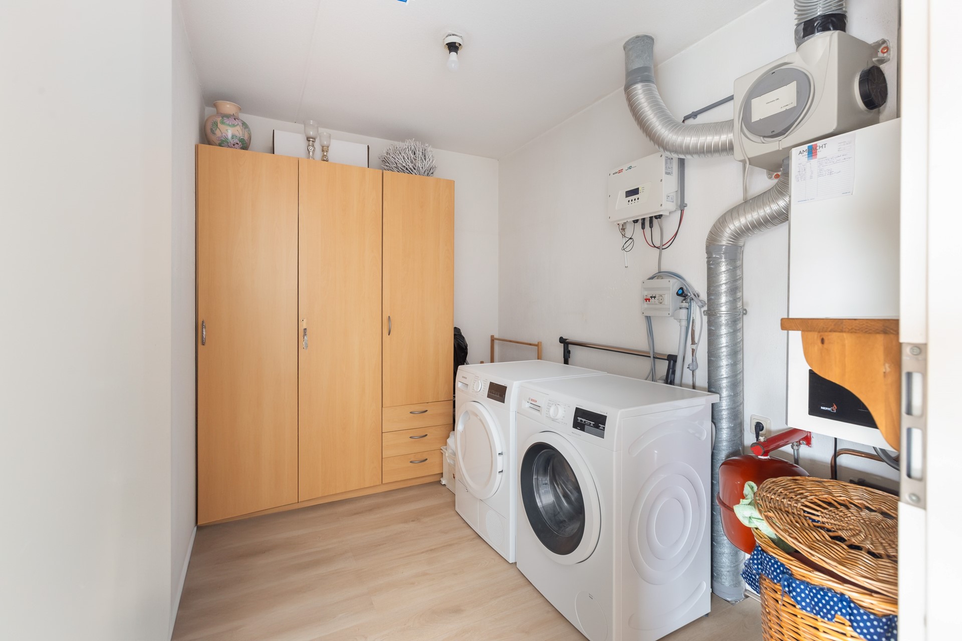 Handige bergruimte met aansluiting voor wasmachine en droger, en extra groep voor de omvormers van de 12 zonnepanelen. Hier bevindt zich tevens de in 2025 geplaatste CV-ketel (Remeha, Avanta Ace 28c) en MV box.
