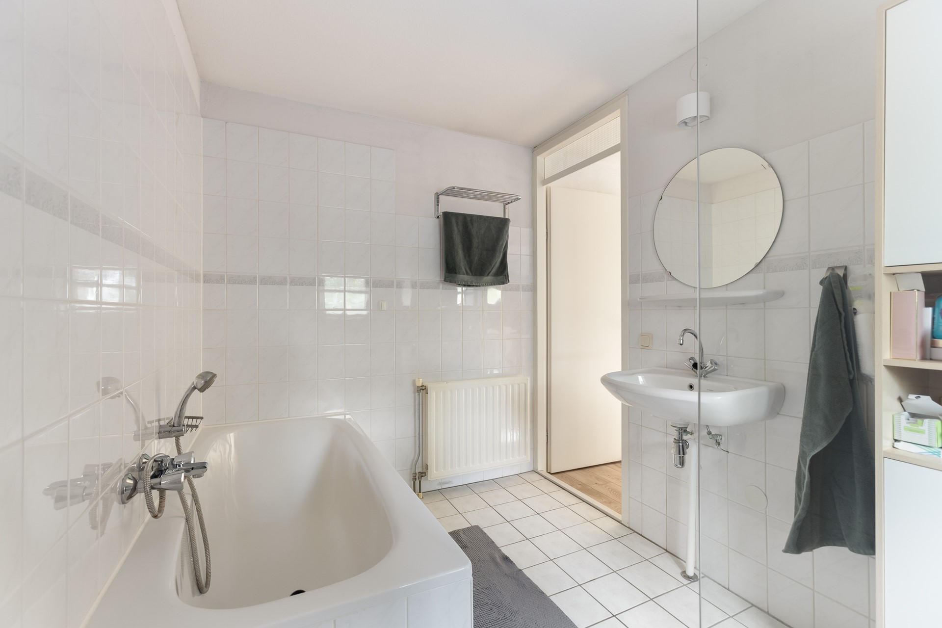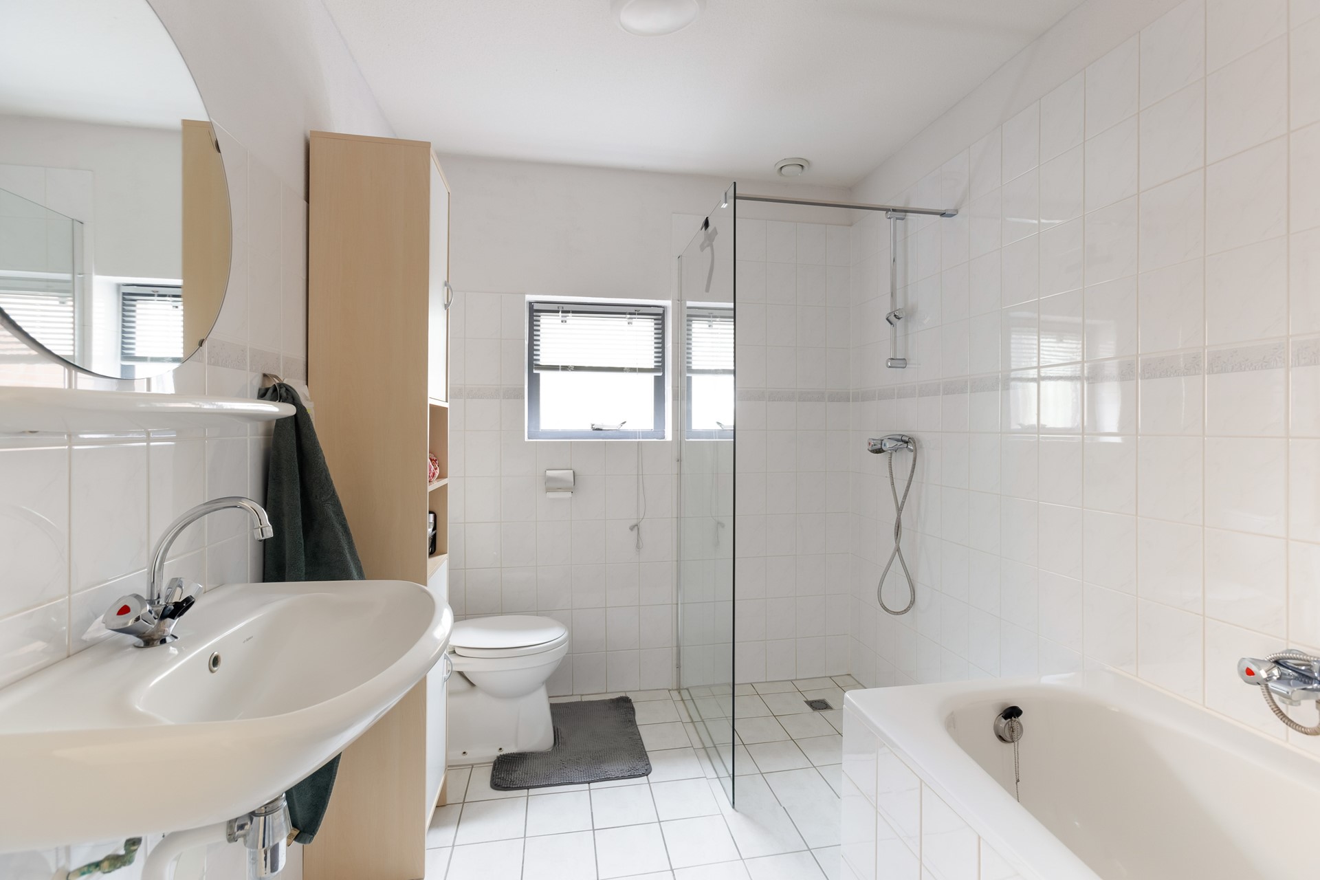 Ruim betegelde badkamer in neutrale kleurstelling met ligbad, inloopdouche, wastafel en toilet. De badkamer is voorzien van mechanische ventilatie, een raam natuurlijke ventilatie en een radiator.