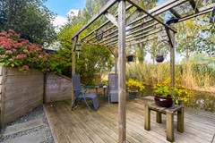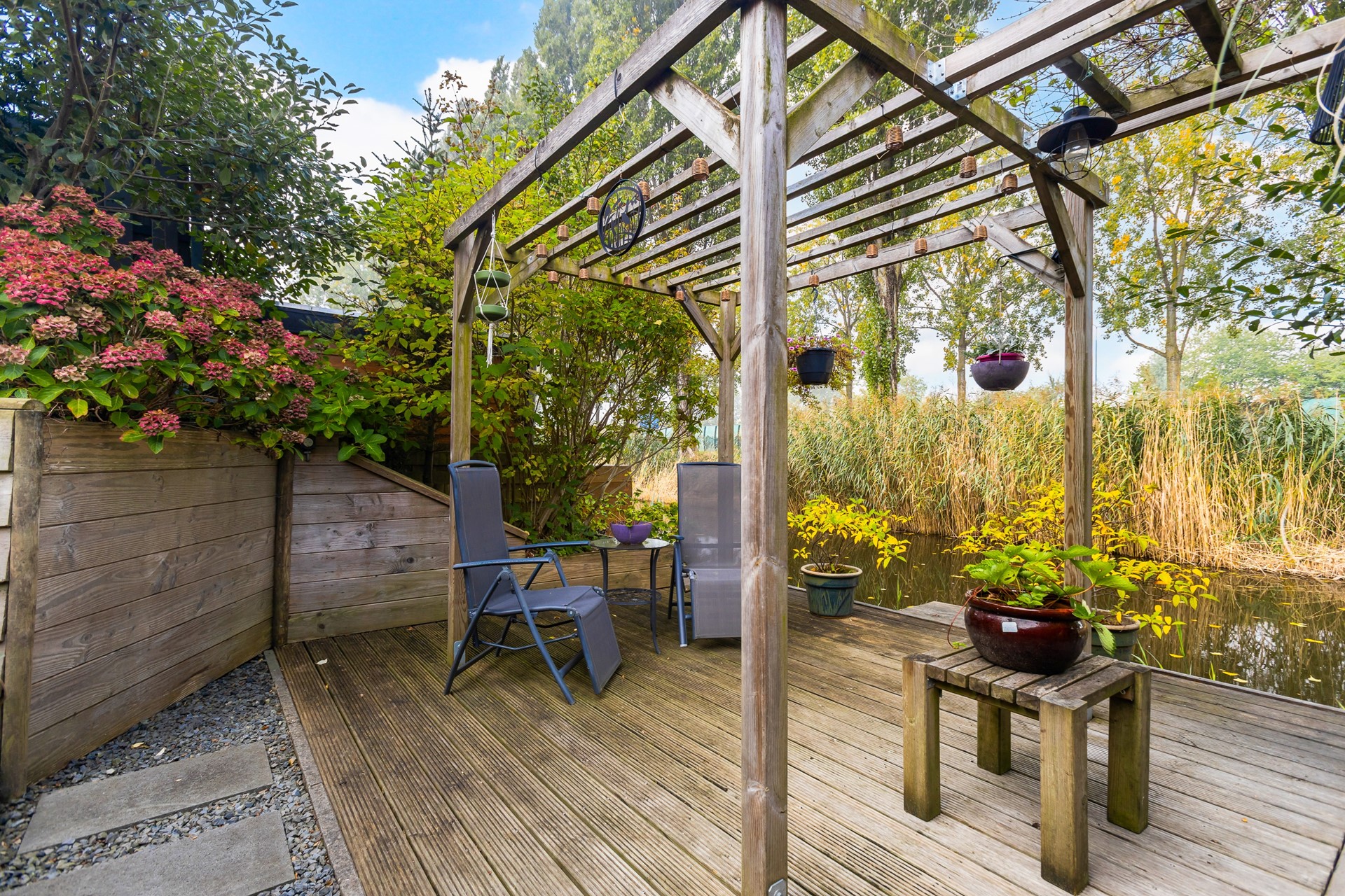 Het terras met pergola grenst aan het water en is gelegen op het zonnige zuidwesten.