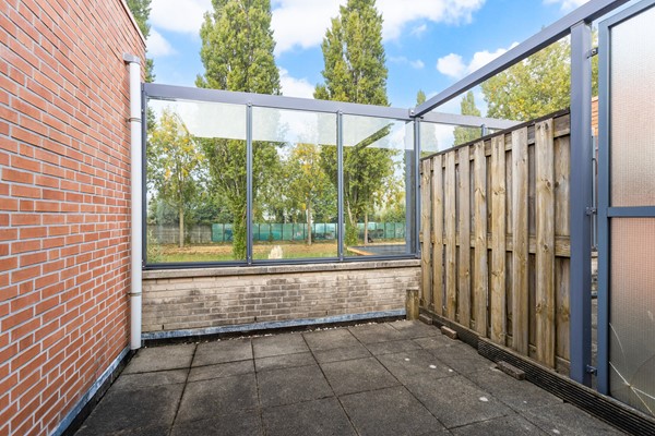 Terras met uitzicht op de achtertuin voorzien van betontegels en glaswerk als balustrade.