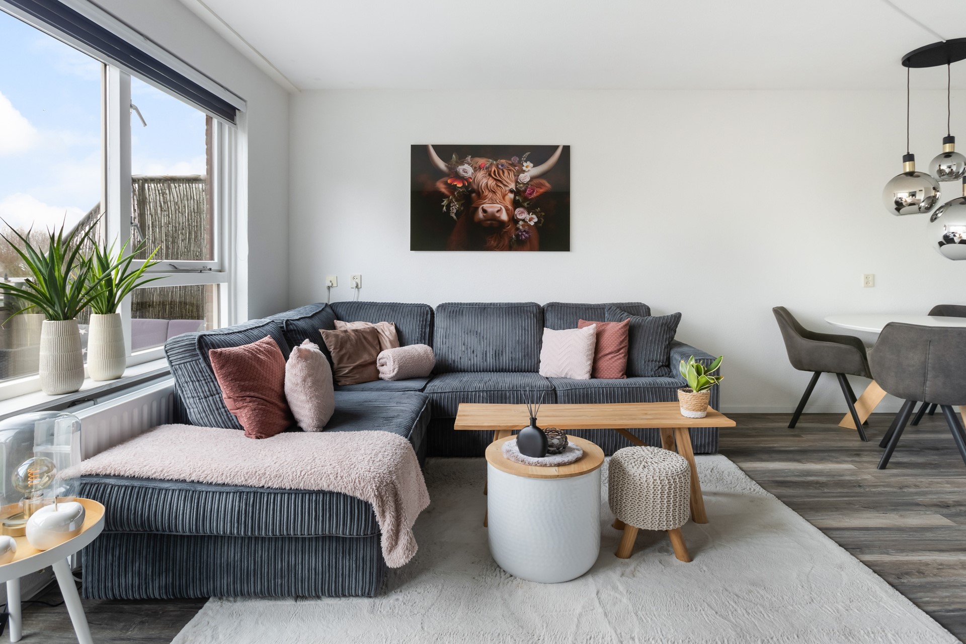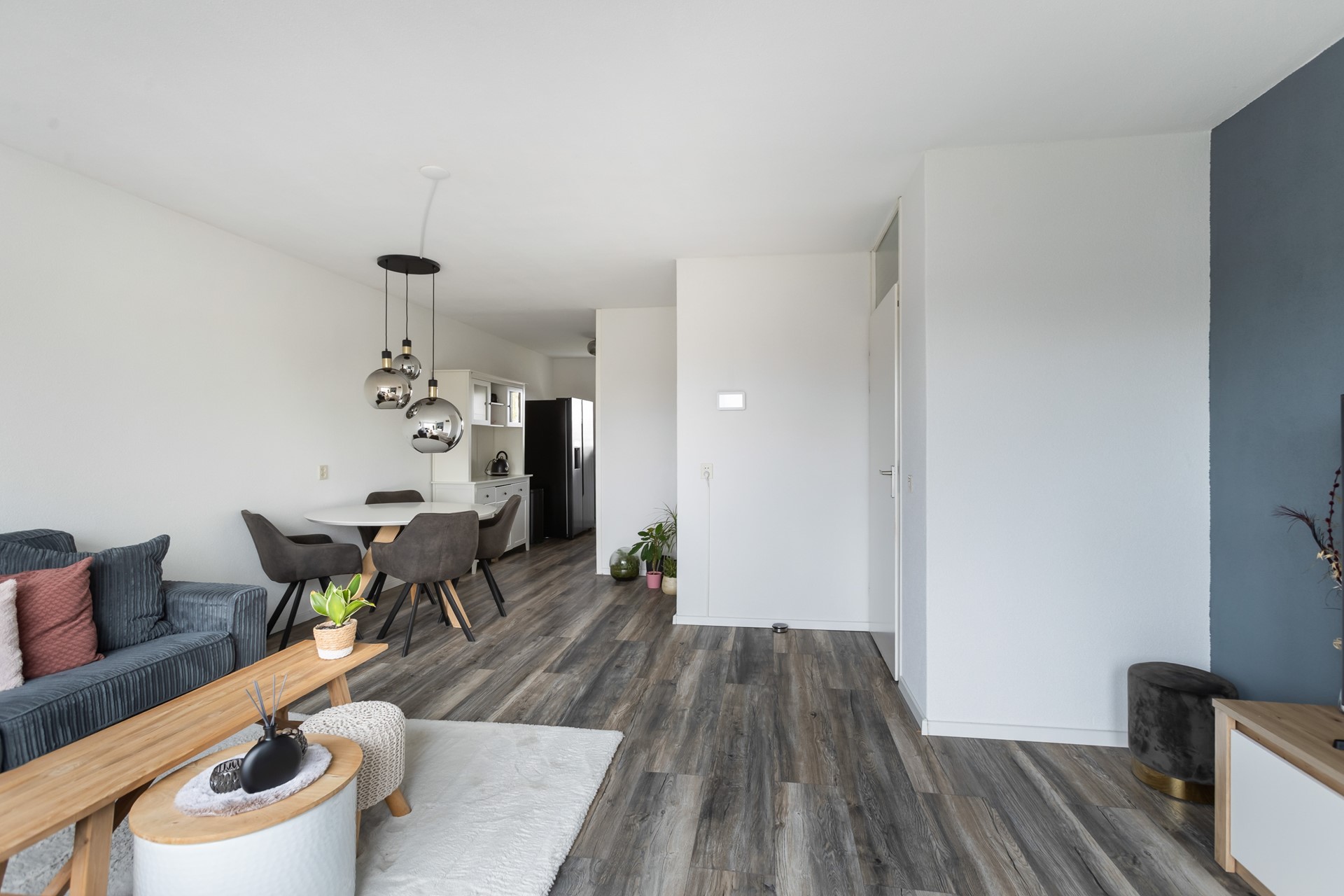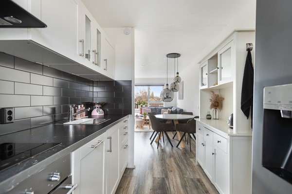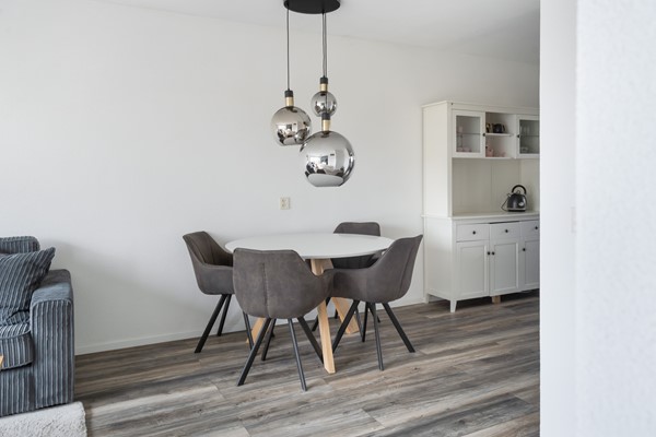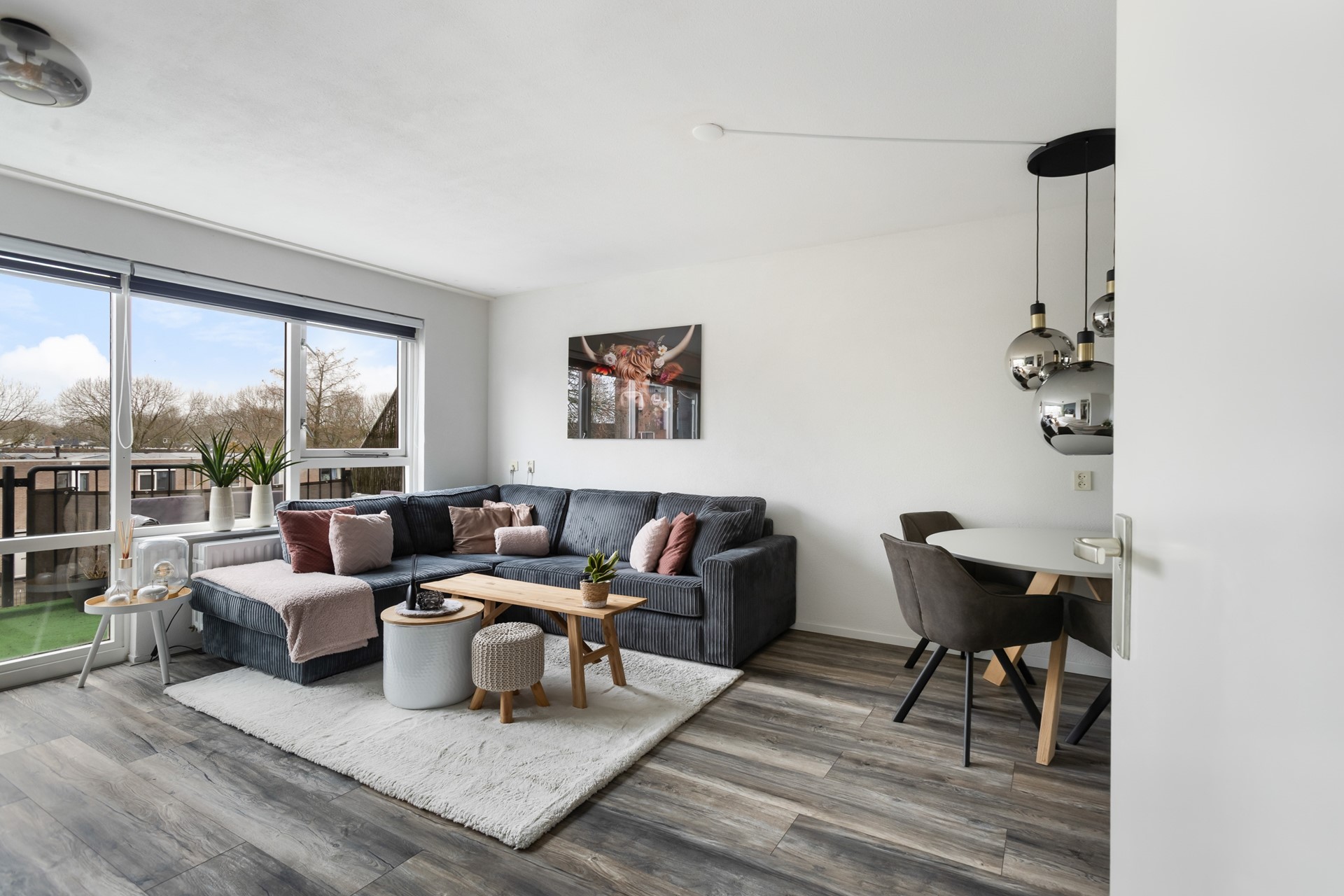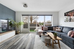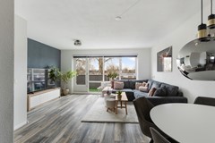 De ruime en lichte woonkamer beschikt over grote raampartijen die zorgen voor een prettige, open sfeer. Vanuit de woonkamer is er directe toegang tot zowel de open keuken als het balkon.