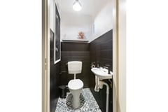 Half betegelde toiletruimte voorzien van een staand toilet en een fonteintje.