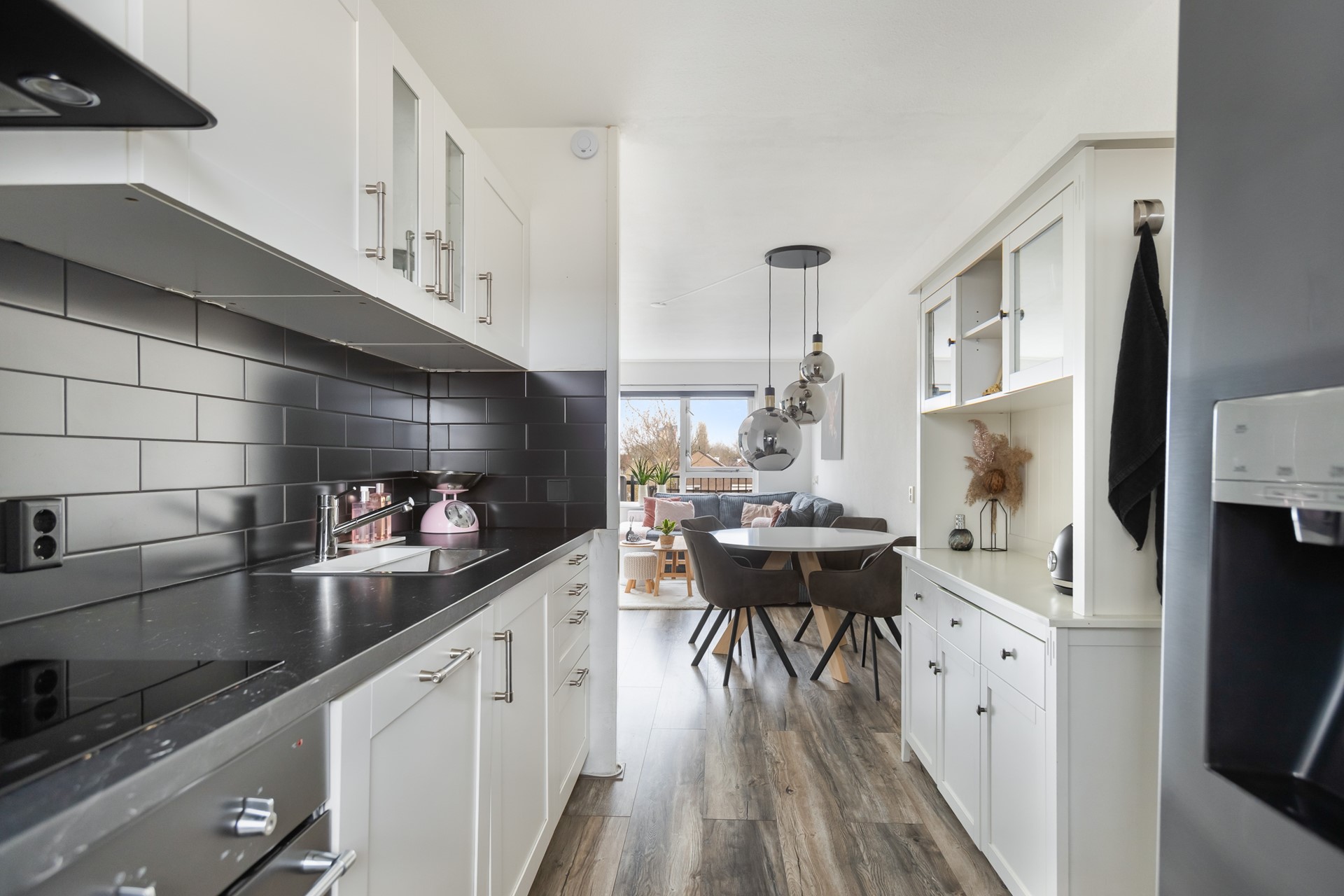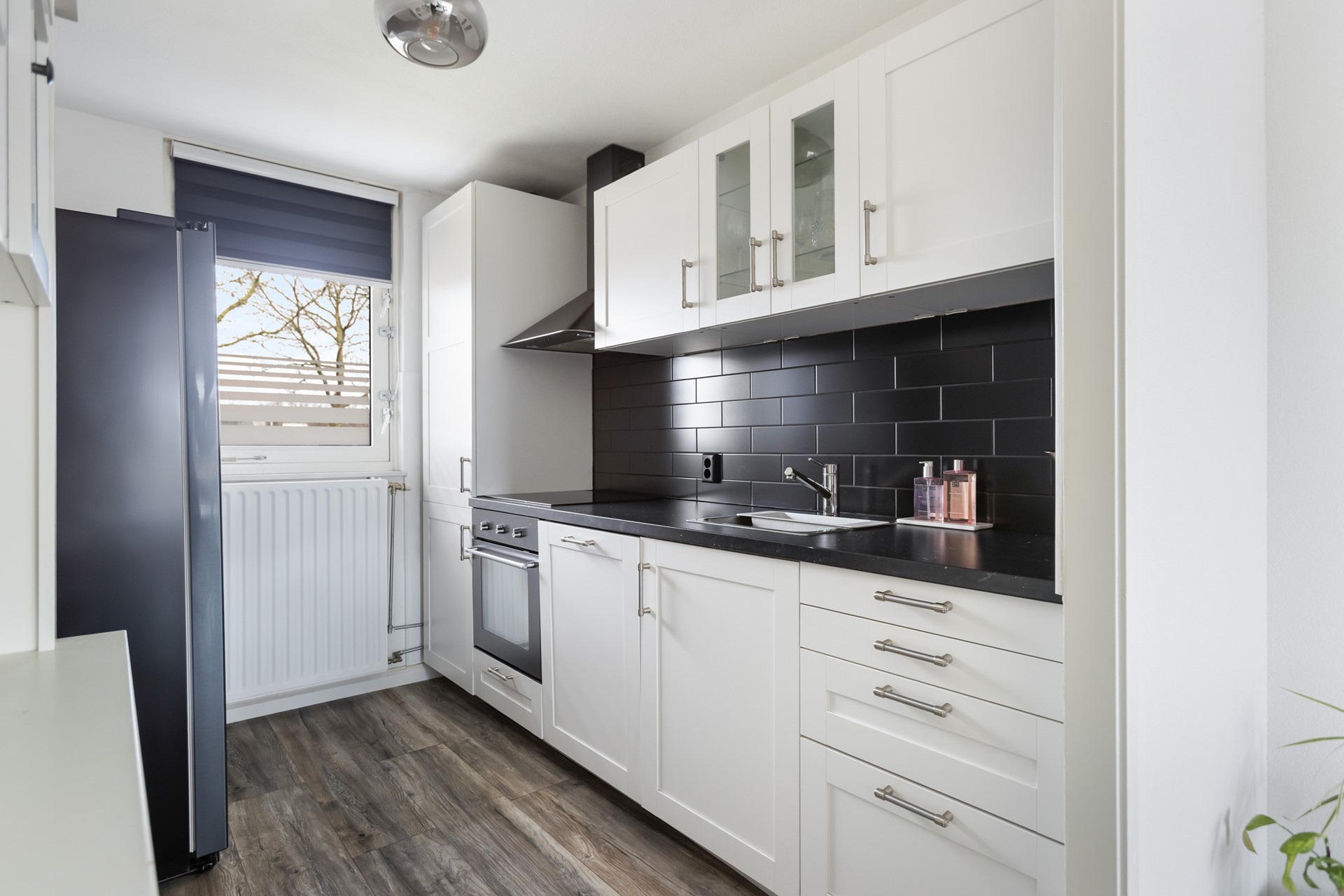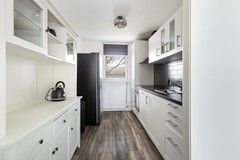 De open keuken in parallelopstelling is uitgevoerd in een neutrale kleur met een zwart werkblad en achterwand. De keuken is uitgerust met een oven, inductiekookplaat met afzuiging, spoelbak, vaatwasser en een losse koelkast. Dankzij de bovenkasten is er voldoende werk- en opbergruimte. Daarnaast zorgt een raam voor extra daglicht. Hier bevindt zich ook de cv-ketel (Remeha Tzerra, 2016).