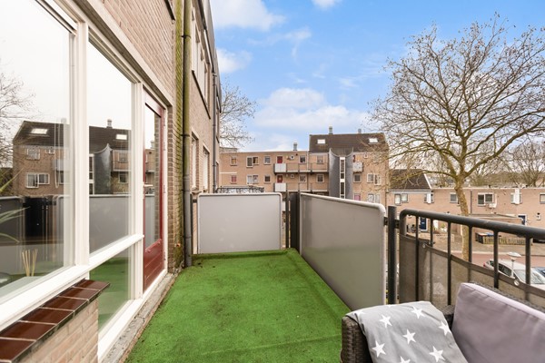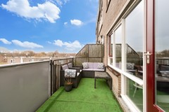Het balkon is direct bereikbaar vanuit de woonkamer en gesitueerd op het westen en is afgewerkt met kunstgras. Een fijne buitenruimte om te ontspannen en te genieten van de middag en zon.