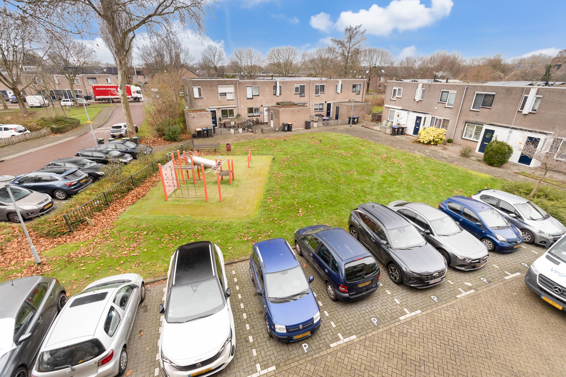Vanuit de woonkamer stap je zo het riante balkon op, waar je uitkijkt op een parkeerplaats met een groene speelplaats. Door de westelijke ligging is dit de ideale plek om te ontspannen en te genieten van de middag- en avondzon op warme dagen.