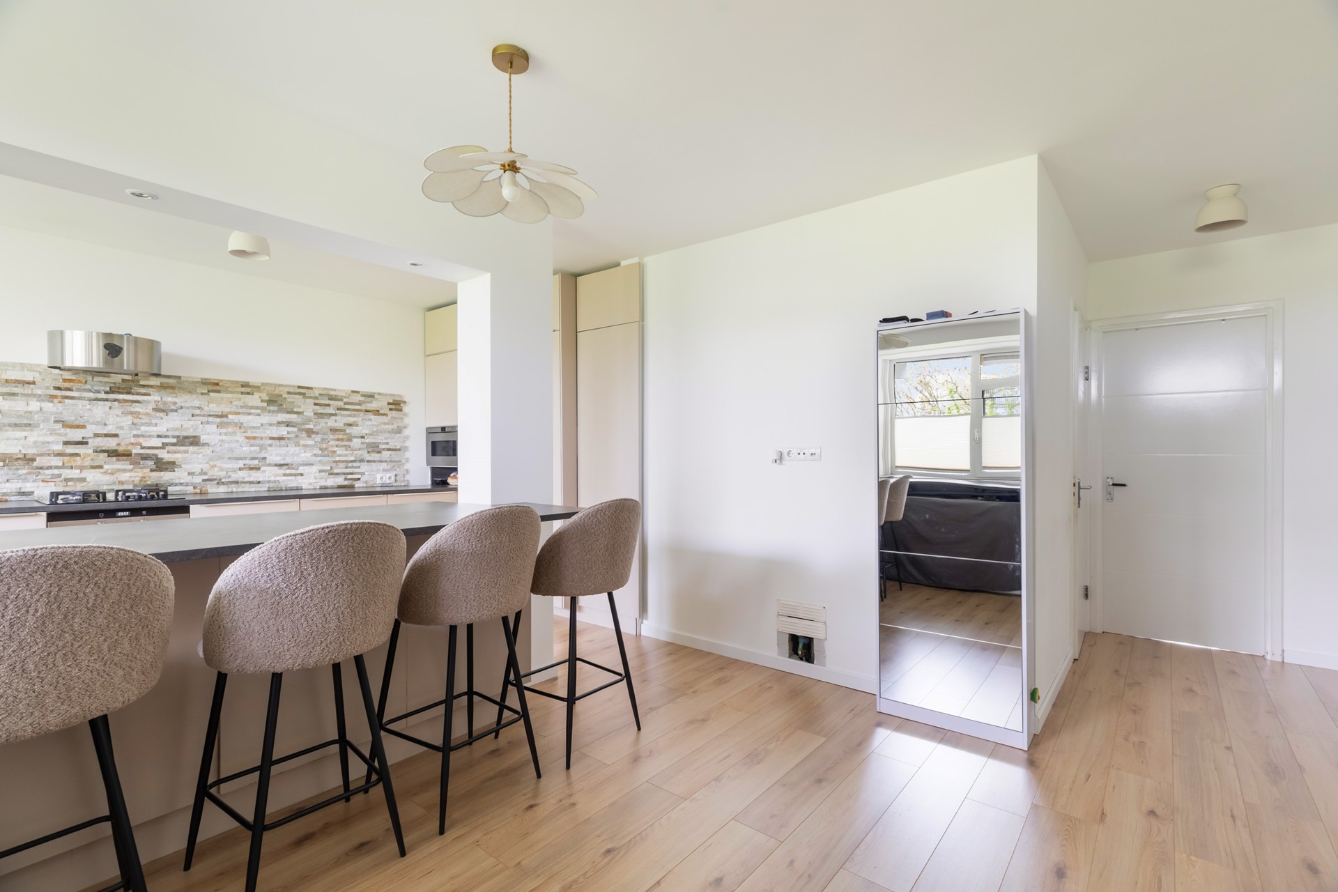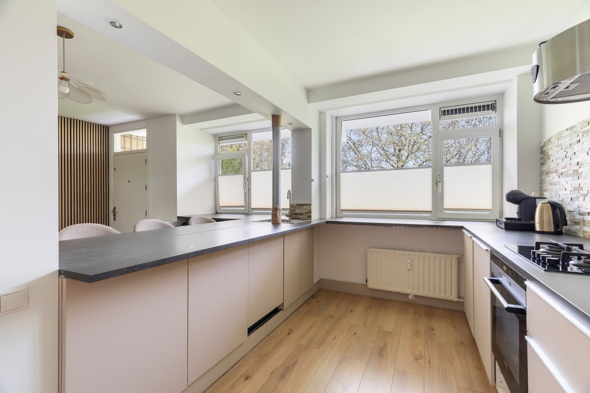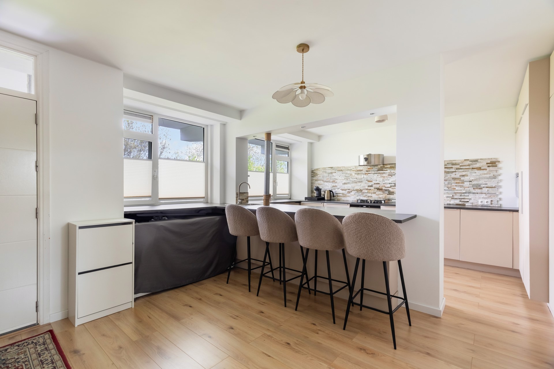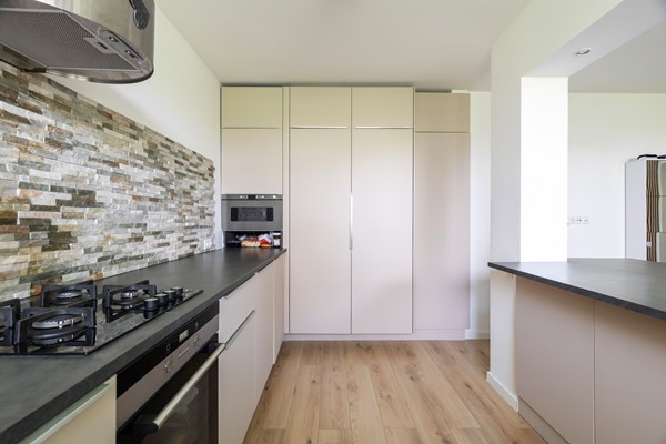 Aan de linkerzijde van de hal bevindt zich de open keuken, die direct opvalt door de baropstelling met ruimte voor vier barstoelen. In het bargedeelte is de spoelbak verwerkt, wat zorgt voor een speelse en praktische indeling. Boven de bar zorgen inbouwspots voor een sfeervolle verlichting. De keuken is uitgevoerd in een beige kleurstelling met een grijs werkblad en beschikt over een gasfornuis met daaronder een oven. De magnetron, een grote koelkast en een grote vriezer zijn weggewerkt in een hoge kastenwand.