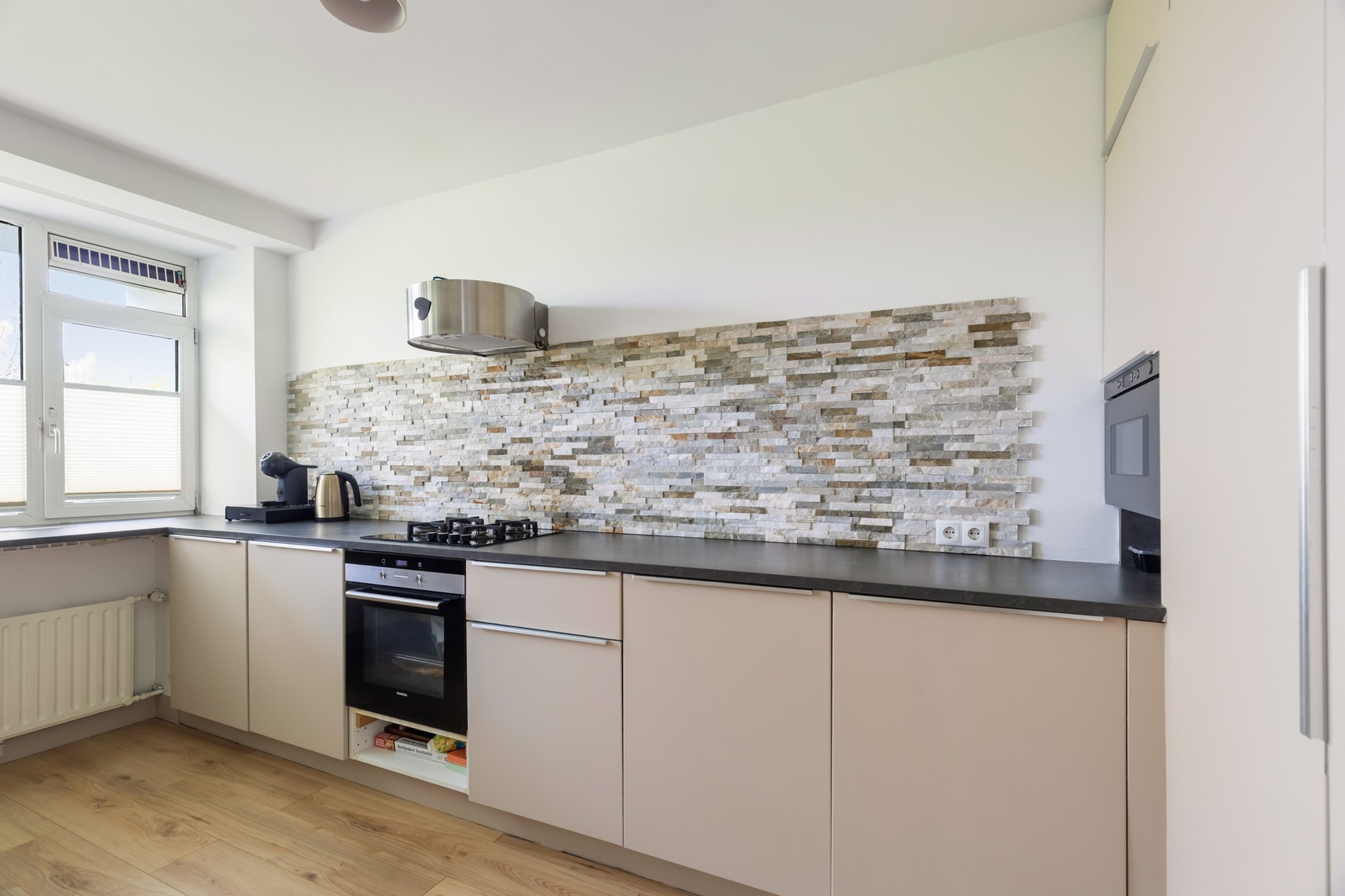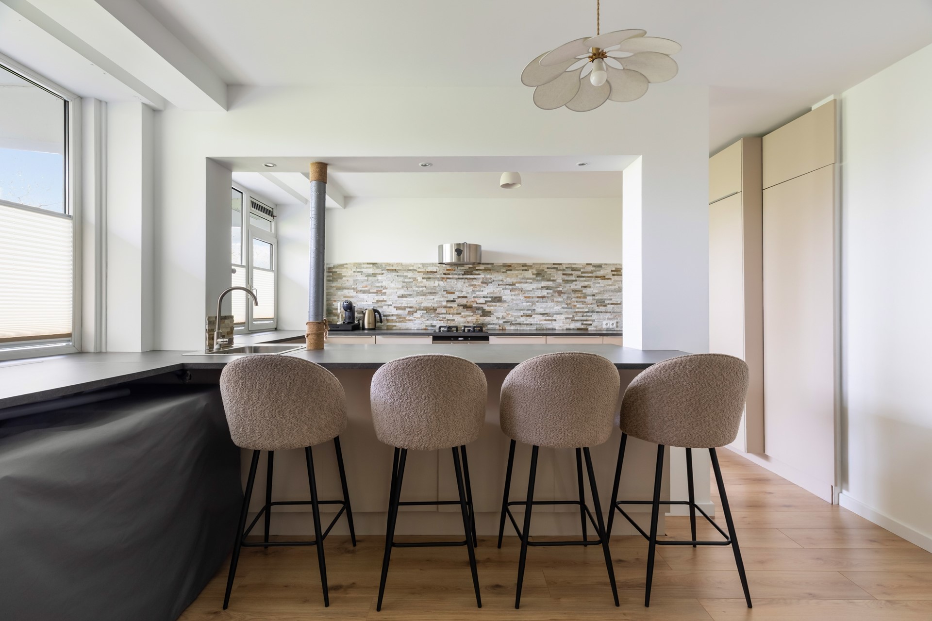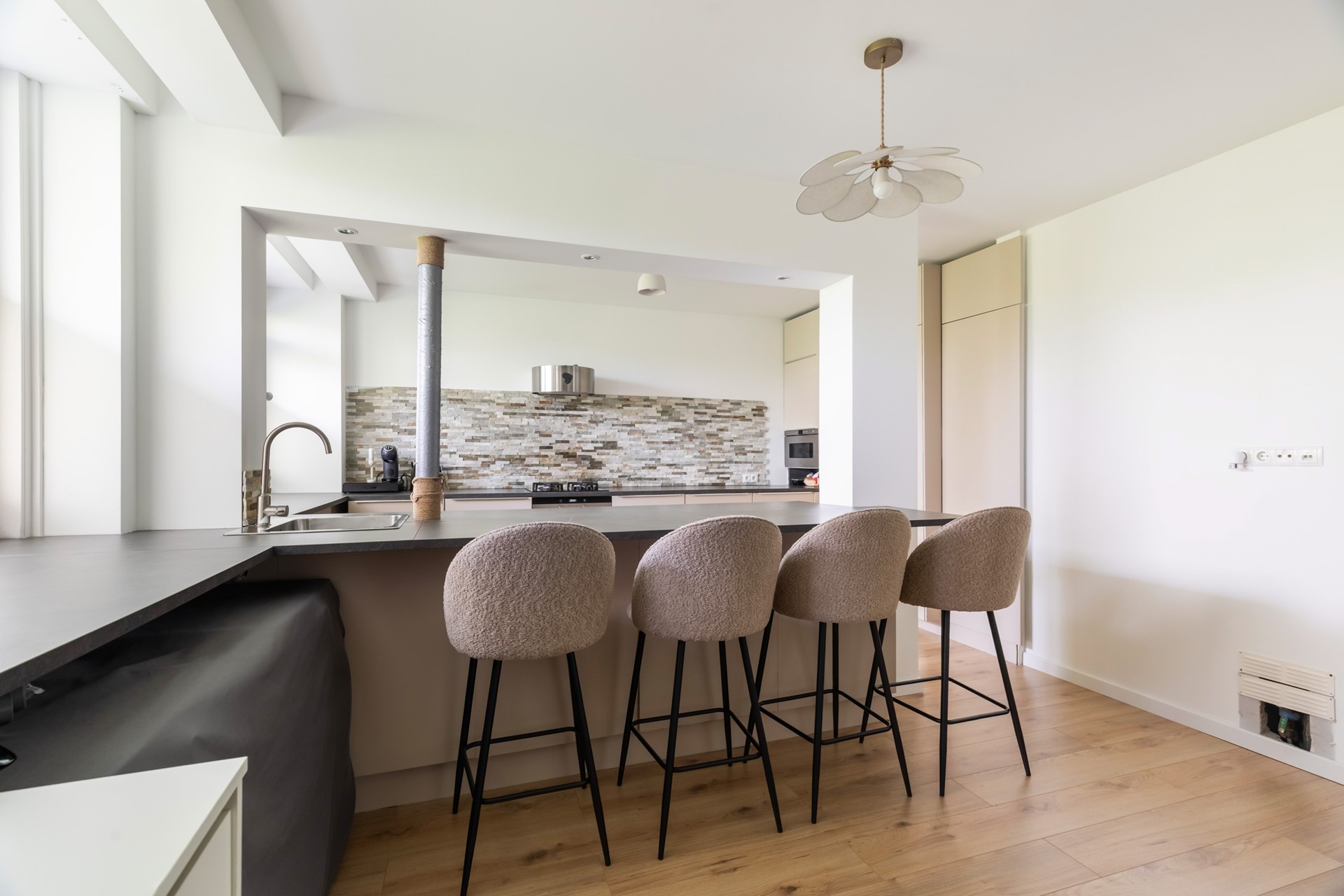 Aan de linkerzijde van de hal bevindt zich de open keuken, die direct opvalt door de baropstelling met ruimte voor vier barstoelen. In het bargedeelte is de spoelbak verwerkt, wat zorgt voor een speelse en praktische indeling. Boven de bar zorgen inbouwspots voor een sfeervolle verlichting. De keuken is uitgevoerd in een beige kleurstelling met een grijs werkblad en beschikt over een gasfornuis met daaronder een oven. De magnetron, een grote koelkast en een grote vriezer zijn weggewerkt in een hoge kastenwand.