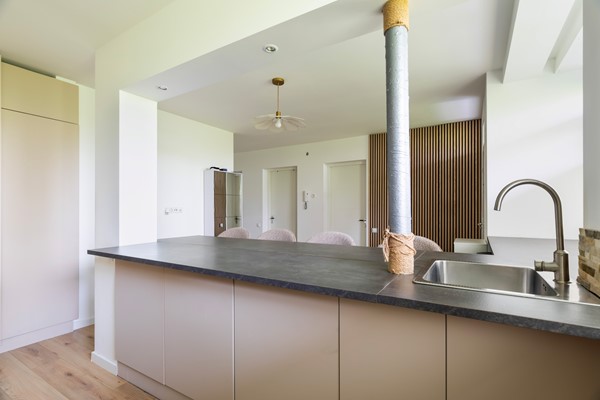 De open keuken met baropstelling vormt een echte eyecatcher en zorgt voor een gezellige en open leefruimte. Dankzij de slimme indeling met twee slaapkamers, een praktische inloopkast en een lichte woonkamer aan de achterzijde, biedt dit appartement verrassend veel comfort en gebruiksgemak.