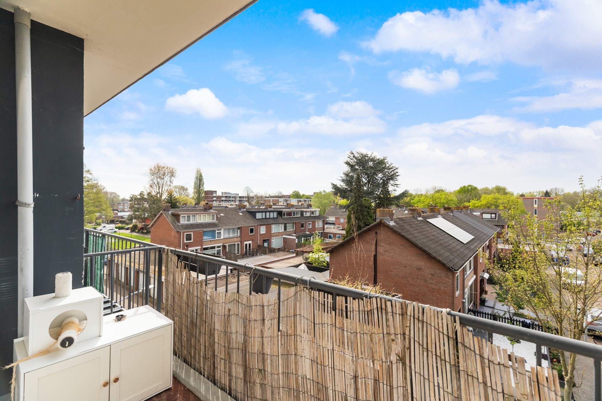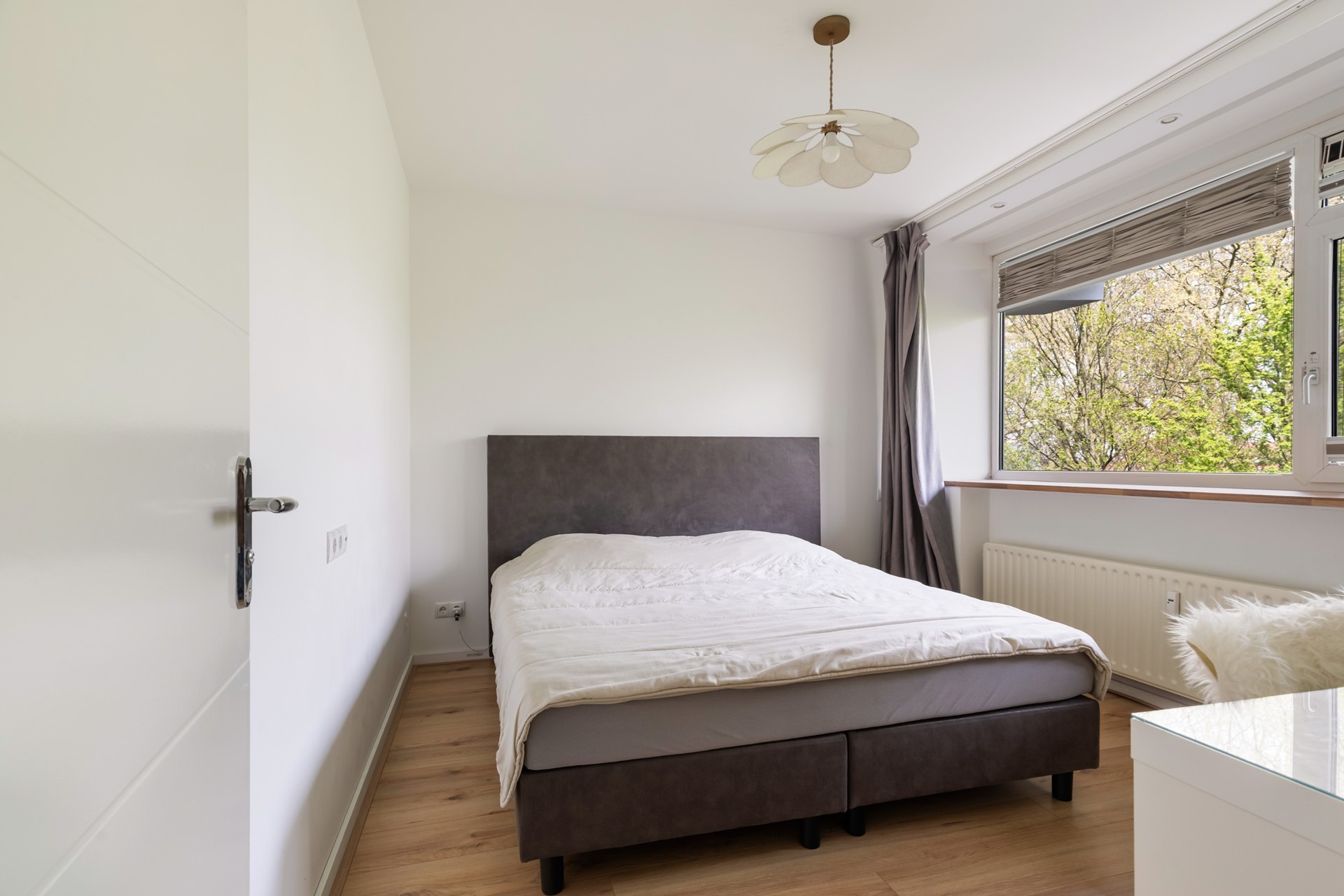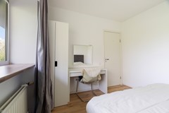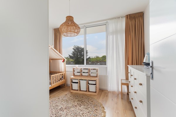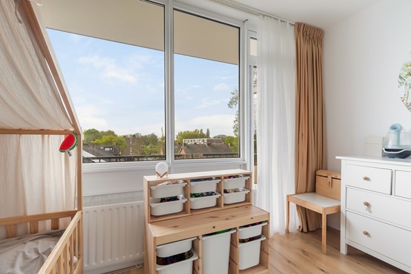 De tweede slaapkamer ligt aan de achterzijde van de woning en biedt directe toegang tot het balkon. Deze kamer is daardoor bijzonder prettig in gebruik, mede dankzij de lichtinval en de verbinding met de buitenruimte.