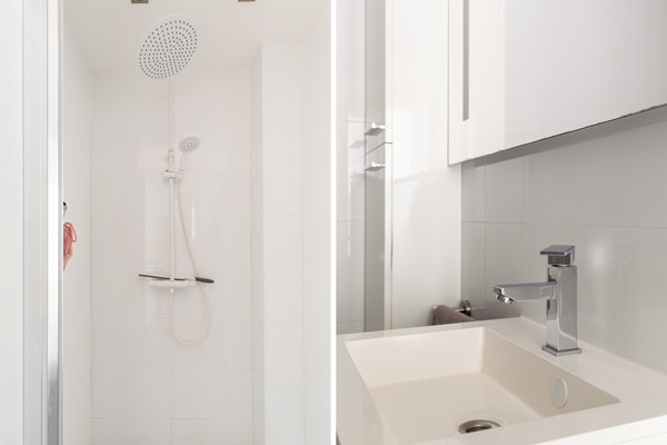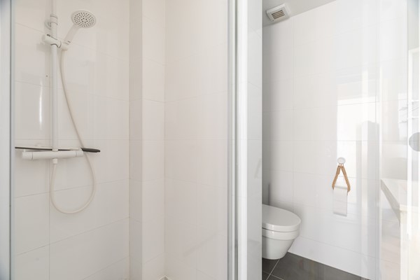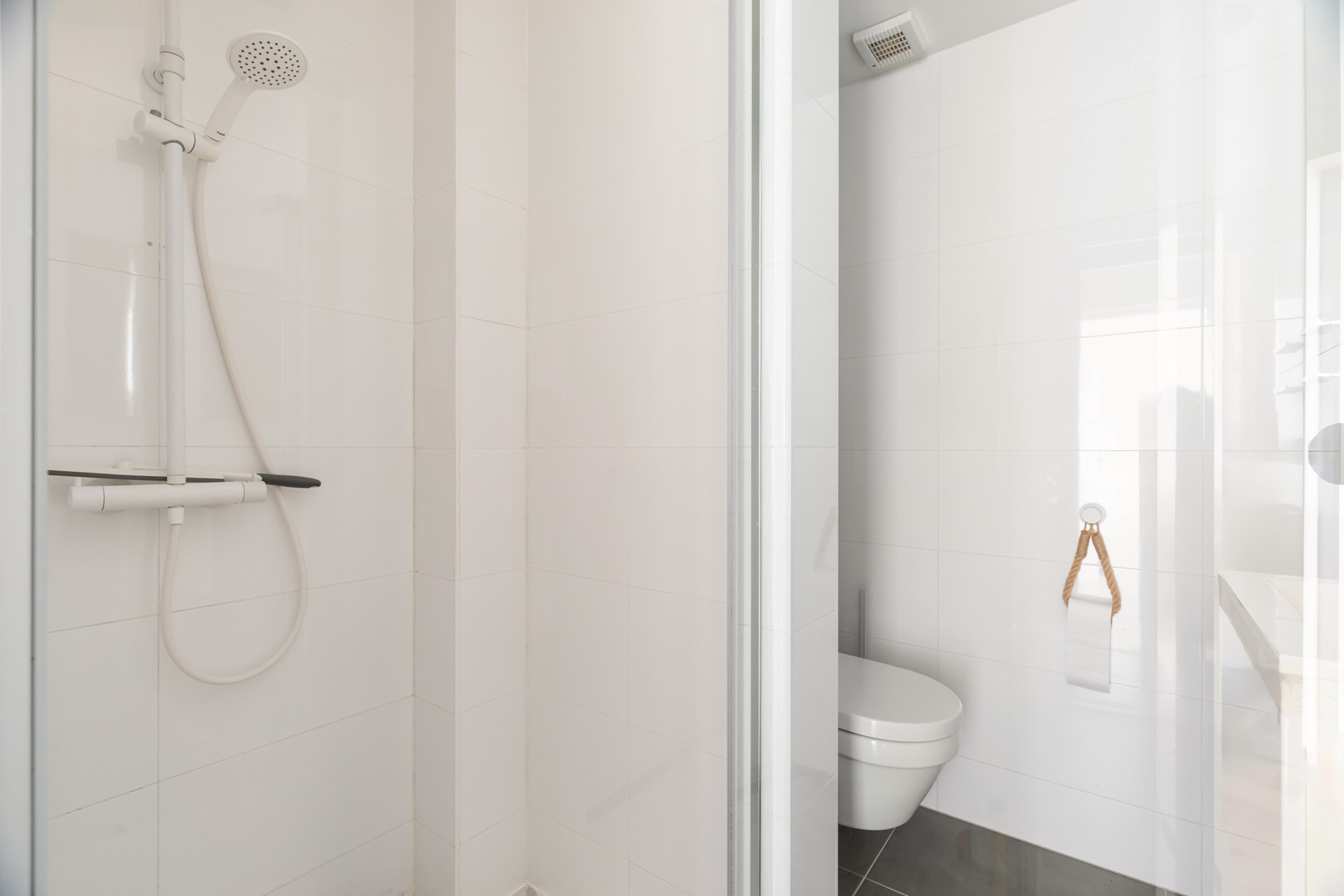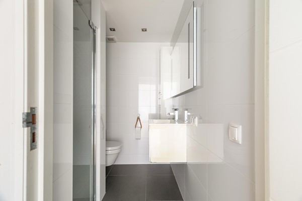 De badkamer is vanuit de hal bereikbaar en is uitgevoerd met grijze vloertegels en witte wandtegels. De ruimte beschikt over een douche, een toilet en een wastafel met een wit meubel, waardoor het geheel een verzorgde uitstraling heeft.