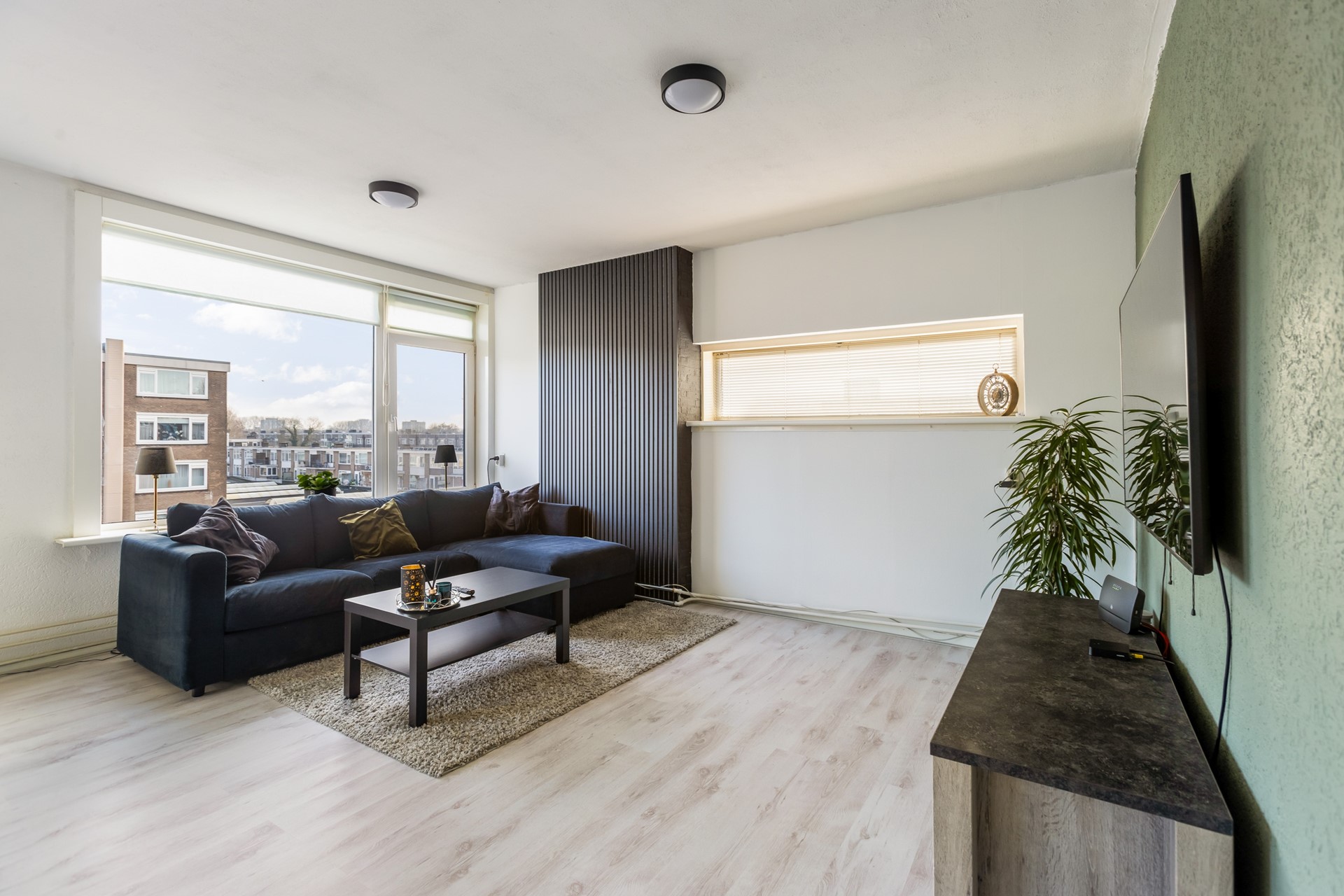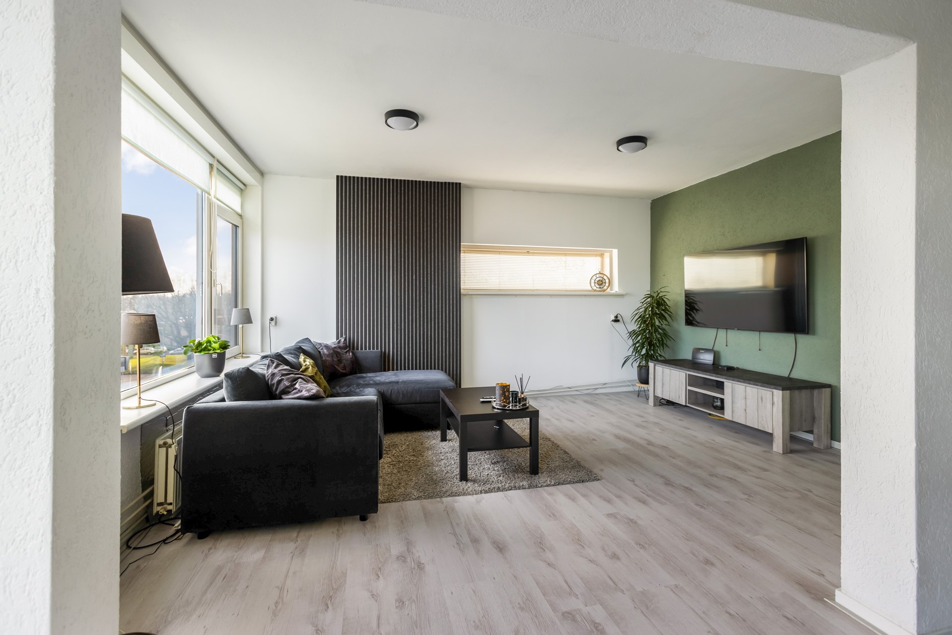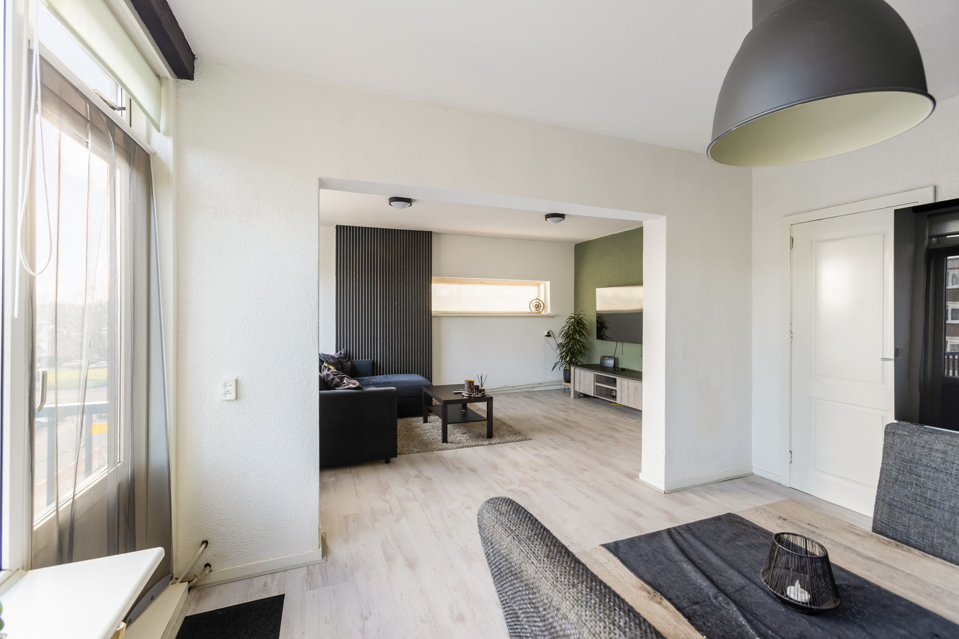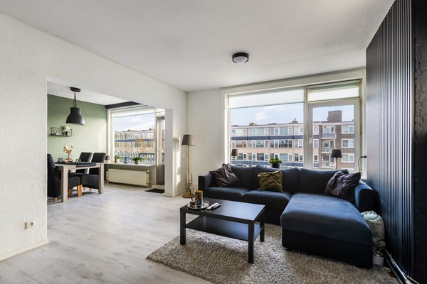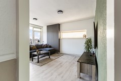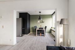 De woonkamer is ruim opgezet en geniet van veel natuurlijk licht dankzij de grote raampartijen. Er is voldoende ruimte voor een comfortabele zithoek. De woonkamer is afgewerkt met een laminaatvloer en is gelegen op het westen.