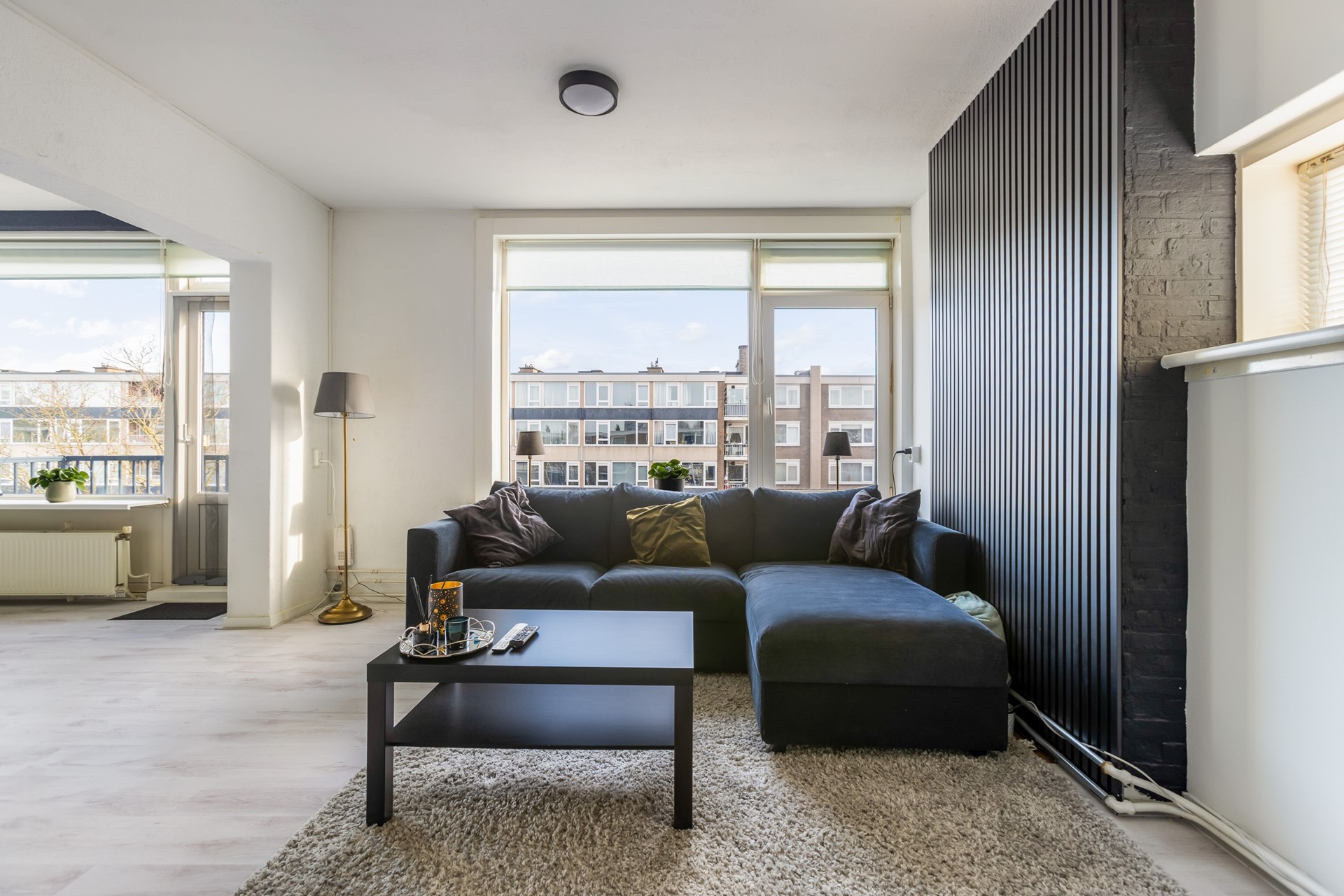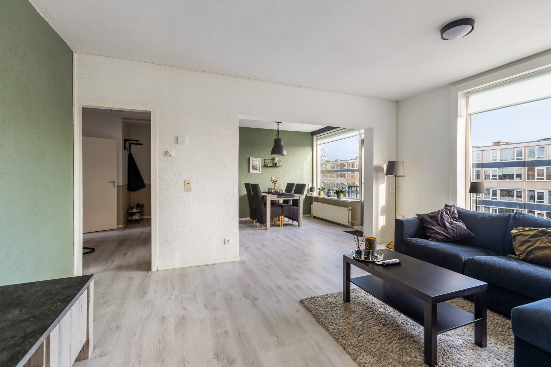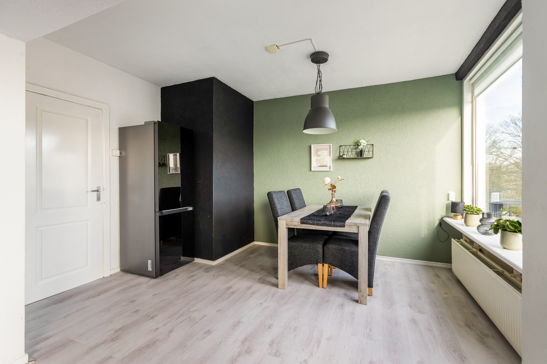 De woonkamer is ruim opgezet en geniet van veel natuurlijk licht dankzij de grote raampartijen. Er is voldoende ruimte voor een comfortabele zithoek. De woonkamer is afgewerkt met een laminaatvloer en is gelegen op het westen.