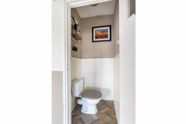 De toiletruimte is voorzien van een los toilet en met houten lambrisering.