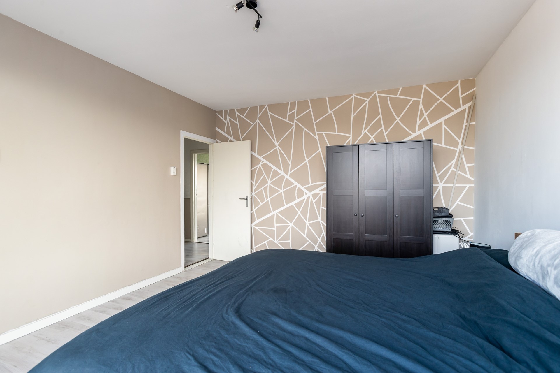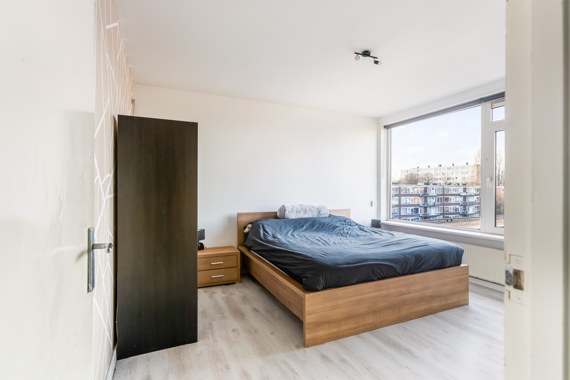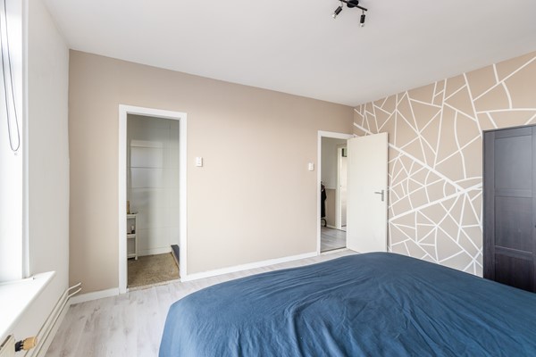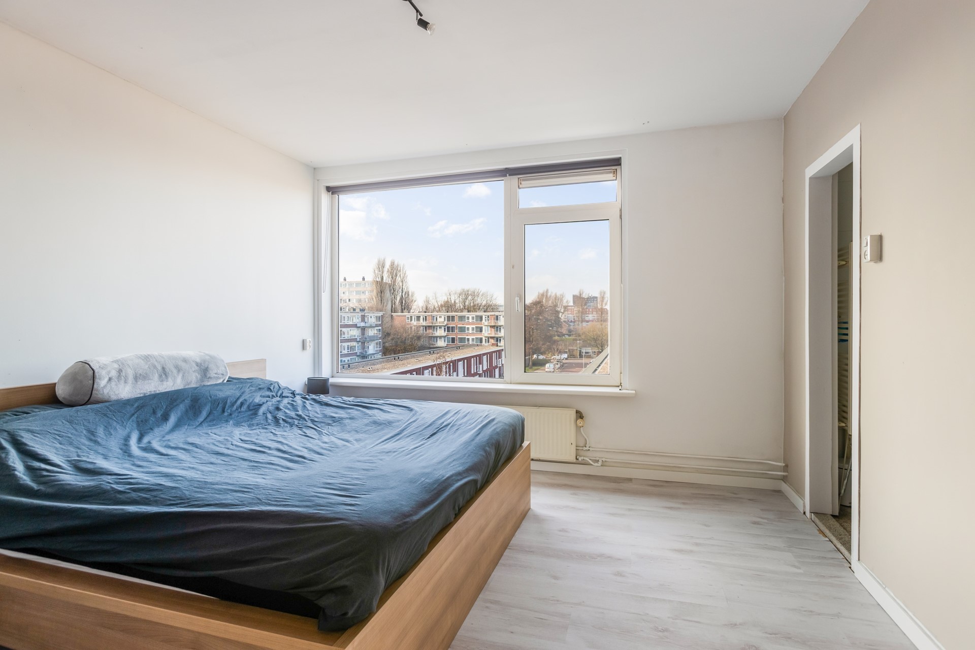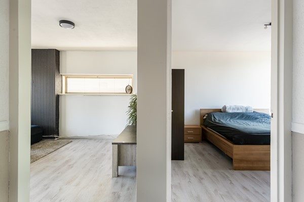 De slaapkamer is voorzien van een laminaatvloer en beschikt over grote raampartijen, wat zorgt voor een prettige lichtinval. De kamer is gelegen op het oosten.