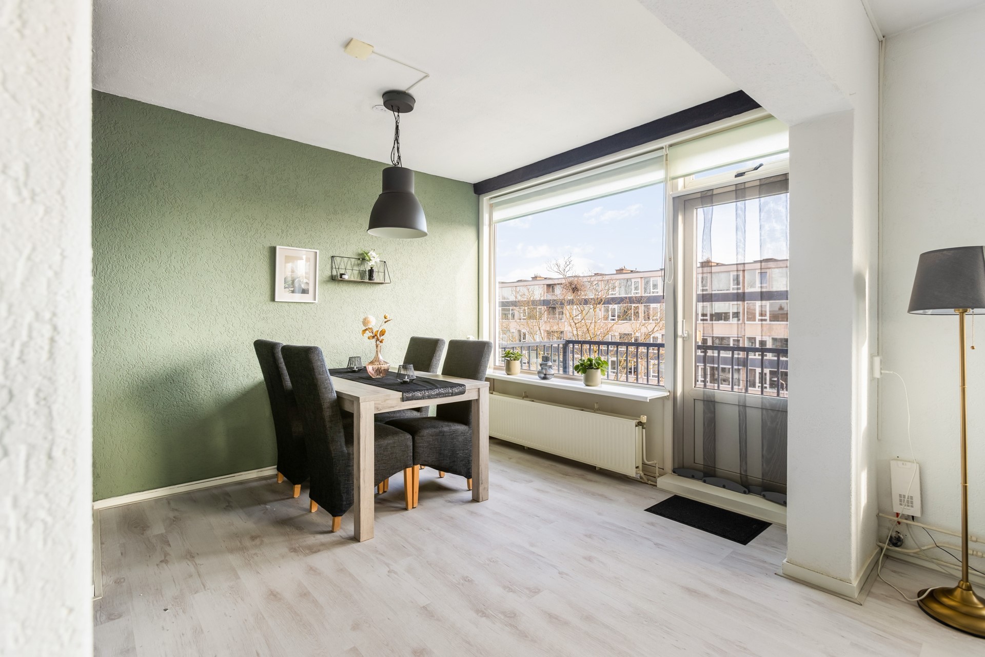 Aangrenzend aan de woonkamer bevindt zich de eetkamer. Deze ruimte kan ook uitstekend te gebruiken als tweede slaapkamer of werkkamer. Vanuit de eetkamer is er toegang tot het balkon aan de voorzijde, eveneens gelegen op het westen. De eetkamer is voorzien van een laminaatvloer.