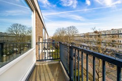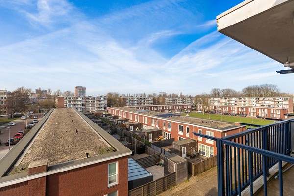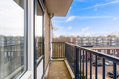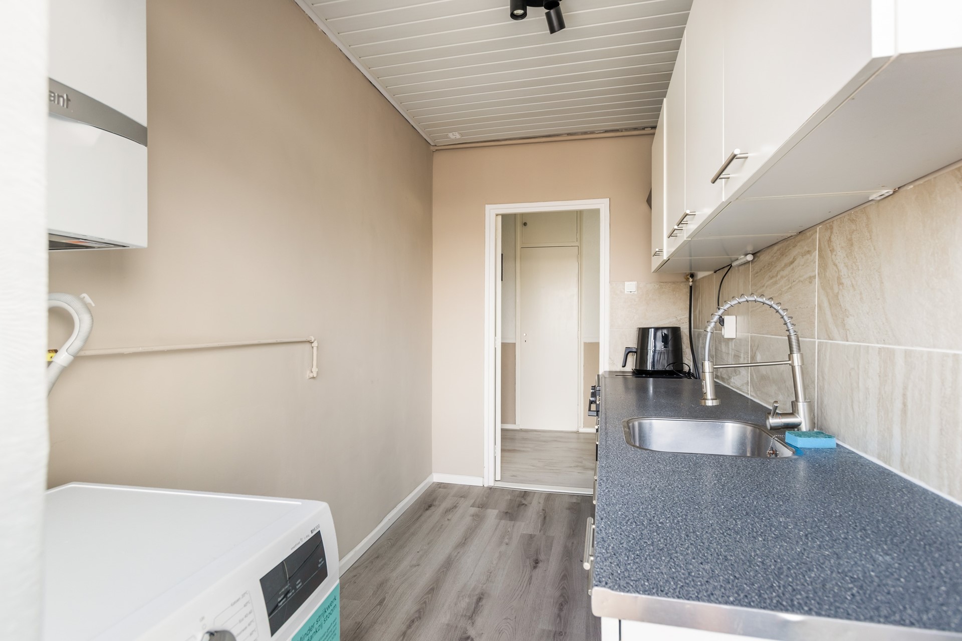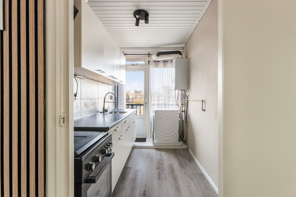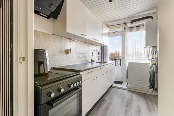 Aan de achterzijde van de woning ligt de keuken met toegang tot het tweede balkon. Dit balkon is gelegen op het oosten, waar je kunt genieten van de ochtendzon. De keuken is uitgevoerd in een witte kleurstelling met een donkergrijs werkblad en beschikt over een los fornuis. Tevens bevinden zich hier de cv-ketel (Vaillant 2021) en de aansluiting voor de wasmachine.