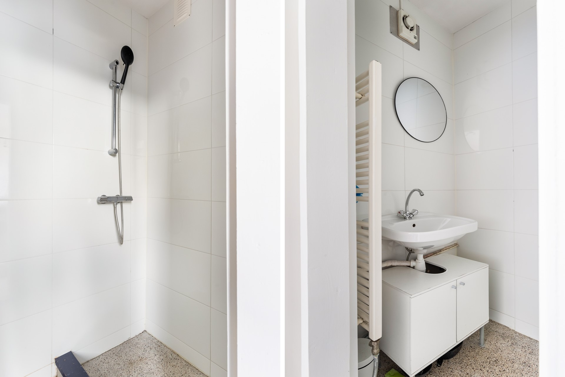 De badkamer is bereikbaar vanuit de slaapkamer en is afgewerkt met witte wandtegels en oud terrazzo granieten vloer. De ruimte is voorzien van een inloopdouche en een wastafel.