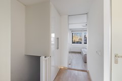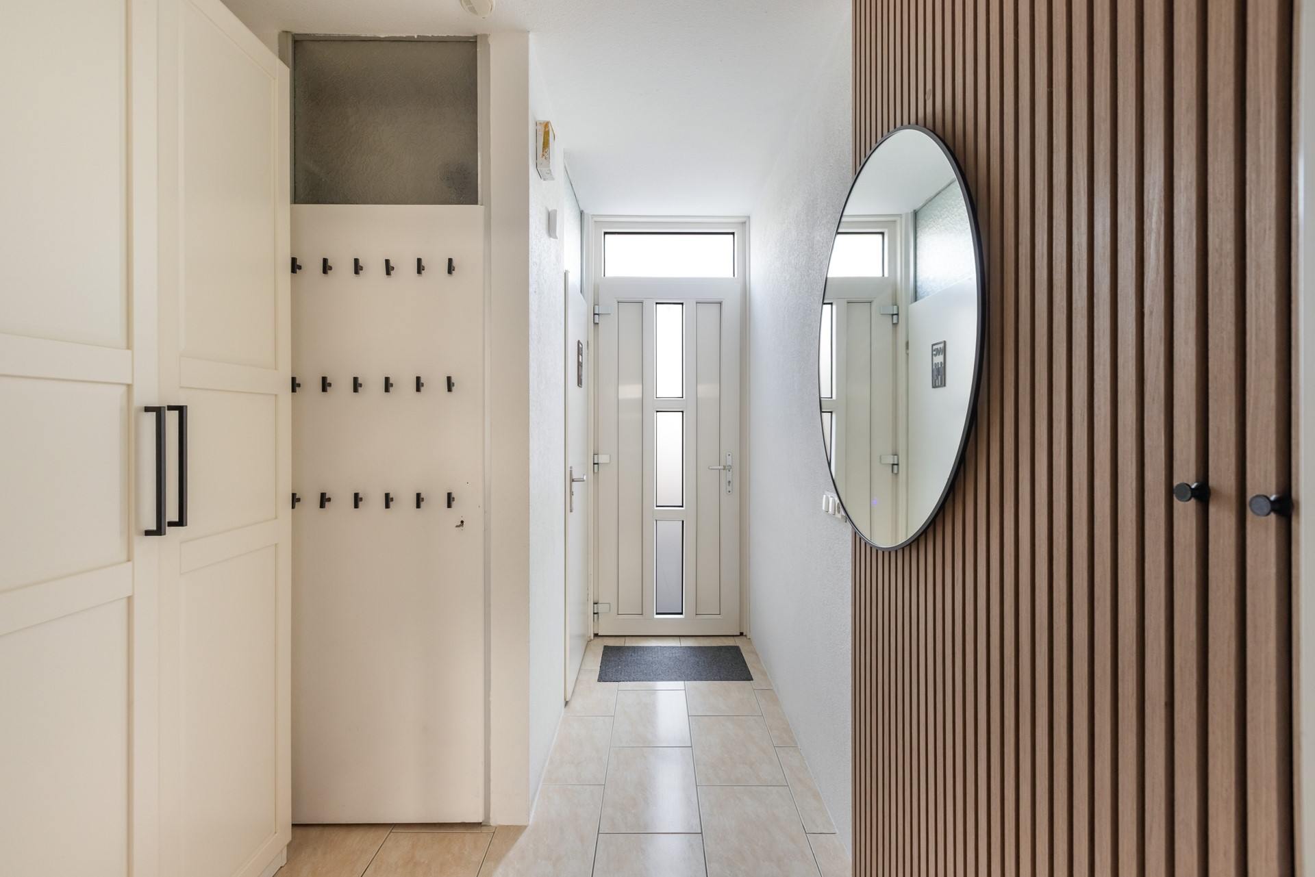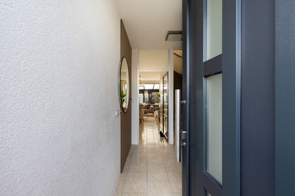 Via de voordeur kom je binnen in de hal. Vanuit hier heb je toegang tot het moderne toilet, de meterkast en de trap naar de eerste verdieping. De meterkast beschikt over maar liefst 11 groepen en slimme meters. De gehele begane grond is voorzien van een beige tegelvloer met comfortabele vloerverwarming.
