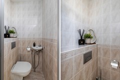 Het toilet is uitgevoerd met een inbouwtoilet en fonteintje en afgewerkt met beige vloer- en wandtegels.