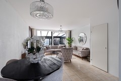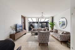 Vanuit de hal stap je de ruime woonkamer binnen. De woonkamer is heerlijk licht en biedt volop ruimte voor een gezellige zithoek en eethoek. Aan de achterzijde bevindt zich een grote schuifpui (2004) die toegang geeft tot de serre.