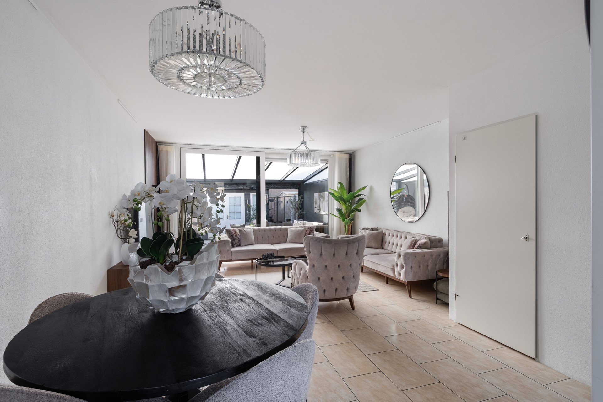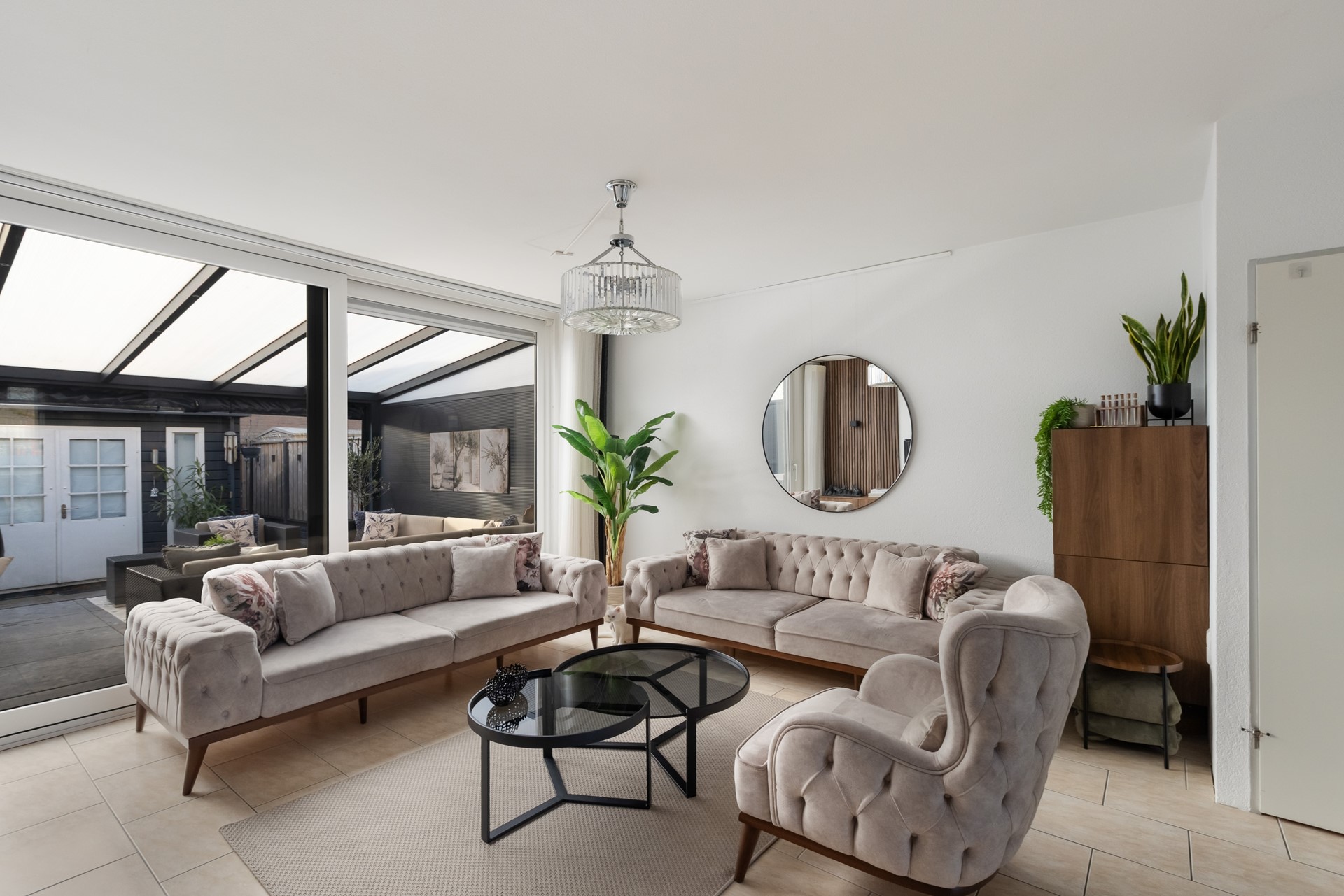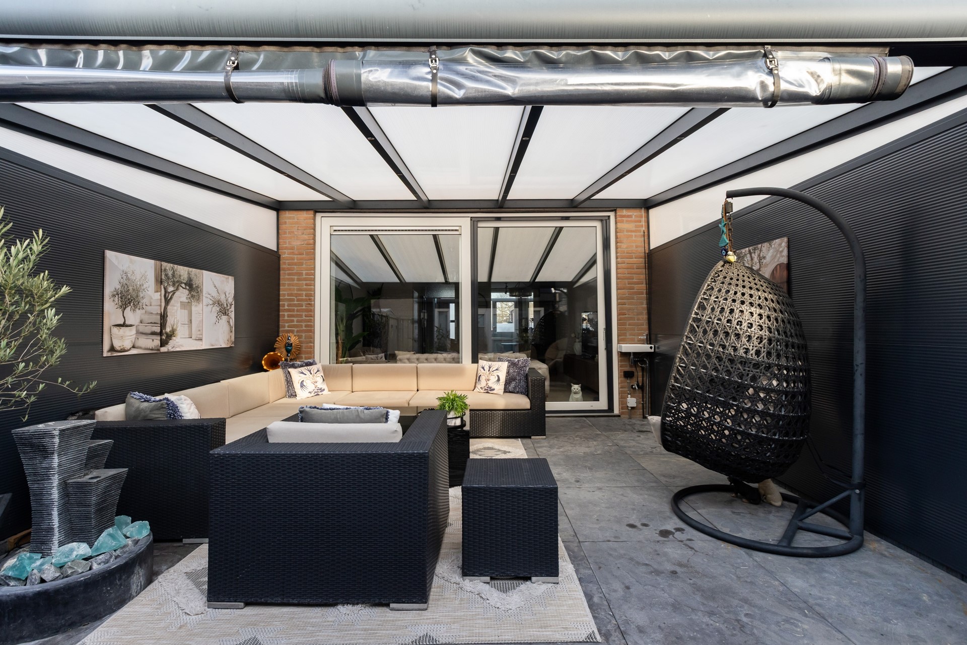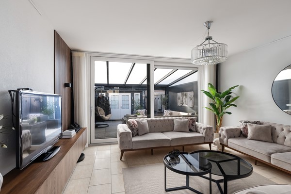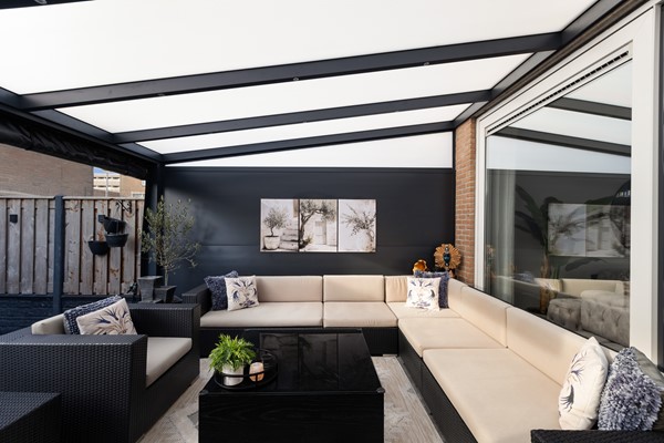De serre is in 2021 geplaatst en vormt een echte verlenging van de woonkamer. Dankzij de ledverlichting en de royale afmetingen is dit een perfecte plek om een grote zithoek te creëren en het hele jaar door van de tuin te genieten.