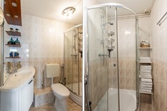 De badkamer is uitgevoerd in beige vloer- en wandtegels en beschikt over een douche, toilet en een wastafel met meubel.