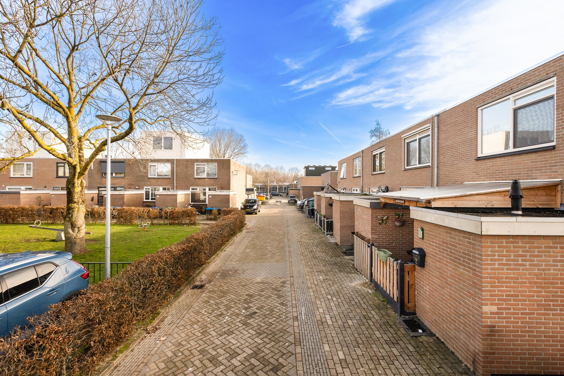 De nette voortuin is strak betegeld met 80x80 cm Bluestone Chinezen hardsteen en voorzien van een hekwerk, wat zorgt voor een verzorgde uitstraling. Aan de voorzijde is tevens een praktische berging aanwezig, ideaal voor fietsen en extra opslag.