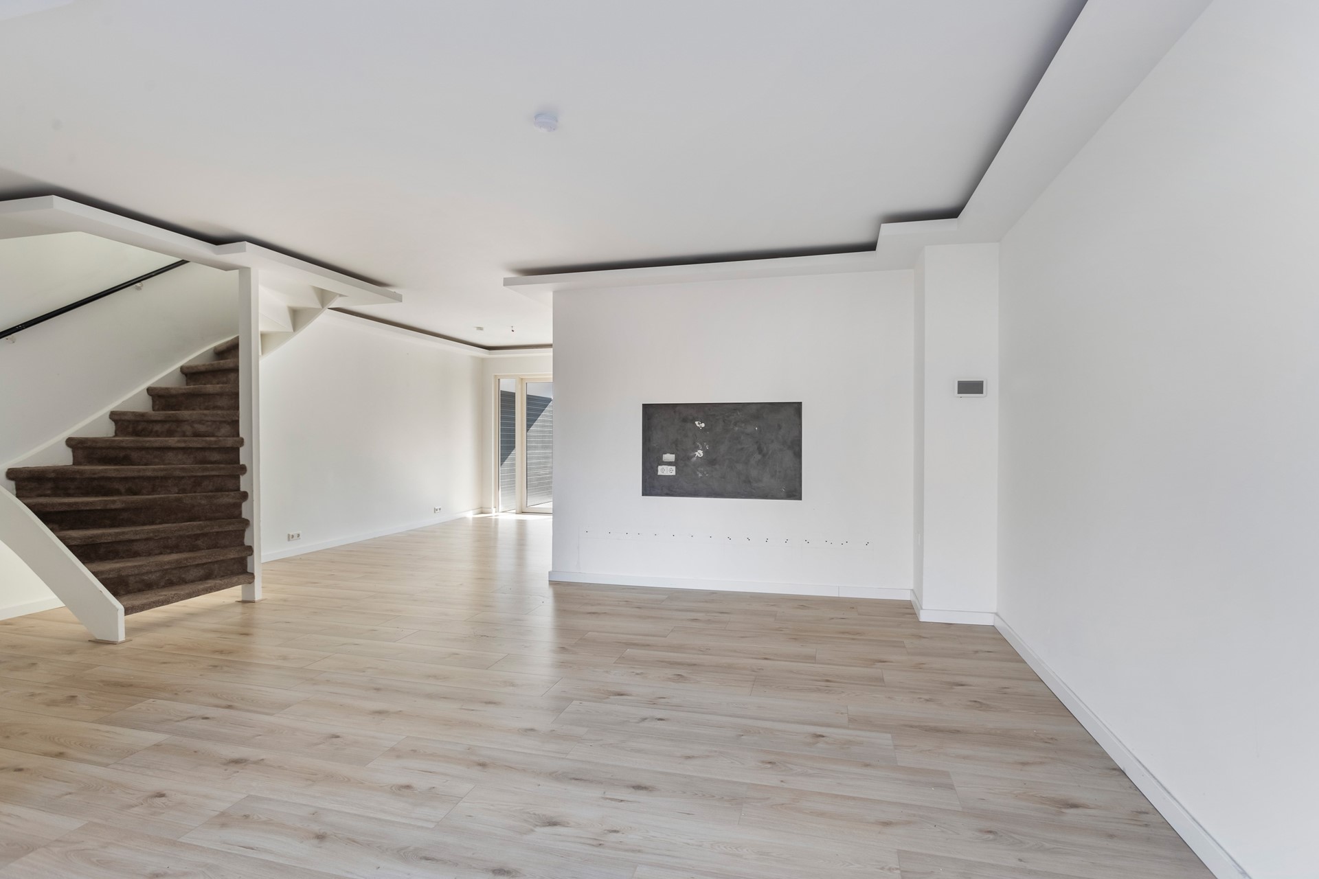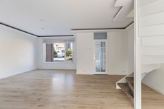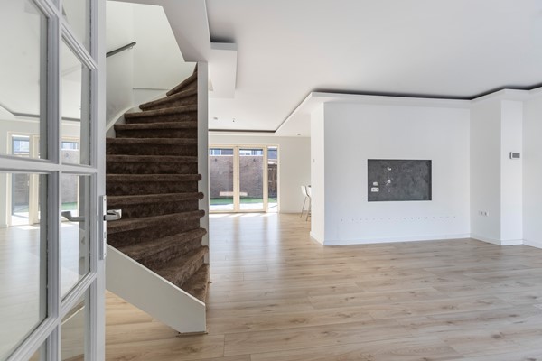Ruime tuingerichte woonkamer met laminaatvloer, glad gestuukt wanden als wandafwerking en inbouwspotjes weggewerkt in een prachtige koof. De woonkamer beschikt tevens over vloerverwarming. De twee openslaande deuren geven toegang naar de heerlijke achtertuin.
